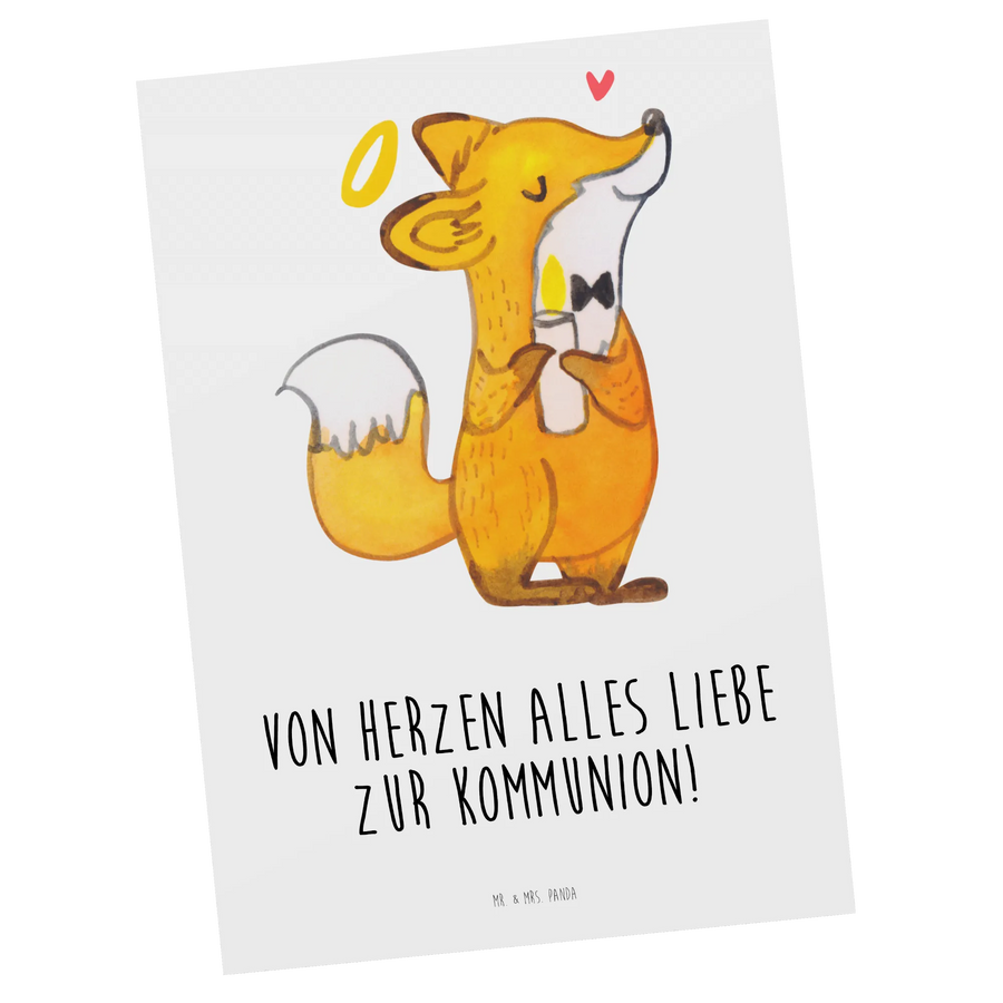 Die wunderschöne Postkarte mit dem Motiv Fuchs zur Kommunion von Mr. & Mrs. Panda ist das perfekte Geschenk für einen besonderen Tag. Wenn Du einem lieben Menschen zur Kommunion gratulieren möchtest, dann ist diese Karte genau das richtige. Sie zeigt einen süßen, stolzen kleinen Fuchs, der mit einer brennenden Kerze und einem Heiligenschein über dem Kopf strahlt. Mit dem liebevollen Spruch 'Von Herzen alles Liebe zur Kommunion!' hinterlässt Du einen bleibenden Eindruck.