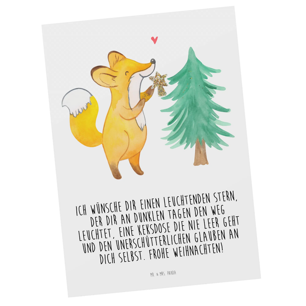 Juhuu – die schönste Zeit im Jahr beginnt! Unsere liebevoll gestaltete Postkarte „Fuchs Weihnachtsbaum" aus der Winter Kollektion von Mr. & Mrs. Panda bringt dir warme, verspielte Weihnachtsstimmung direkt ins Haus. Auf der Vorderseite siehst du einen fröhlichen Fuchs, der gerade einen goldenen Stern an die Spitze eines üppigen Tannenbaums setzen möchte. Ein kleines, rotes Herz schwebt über ihm und verleiht der Szene eine zärtliche Note.