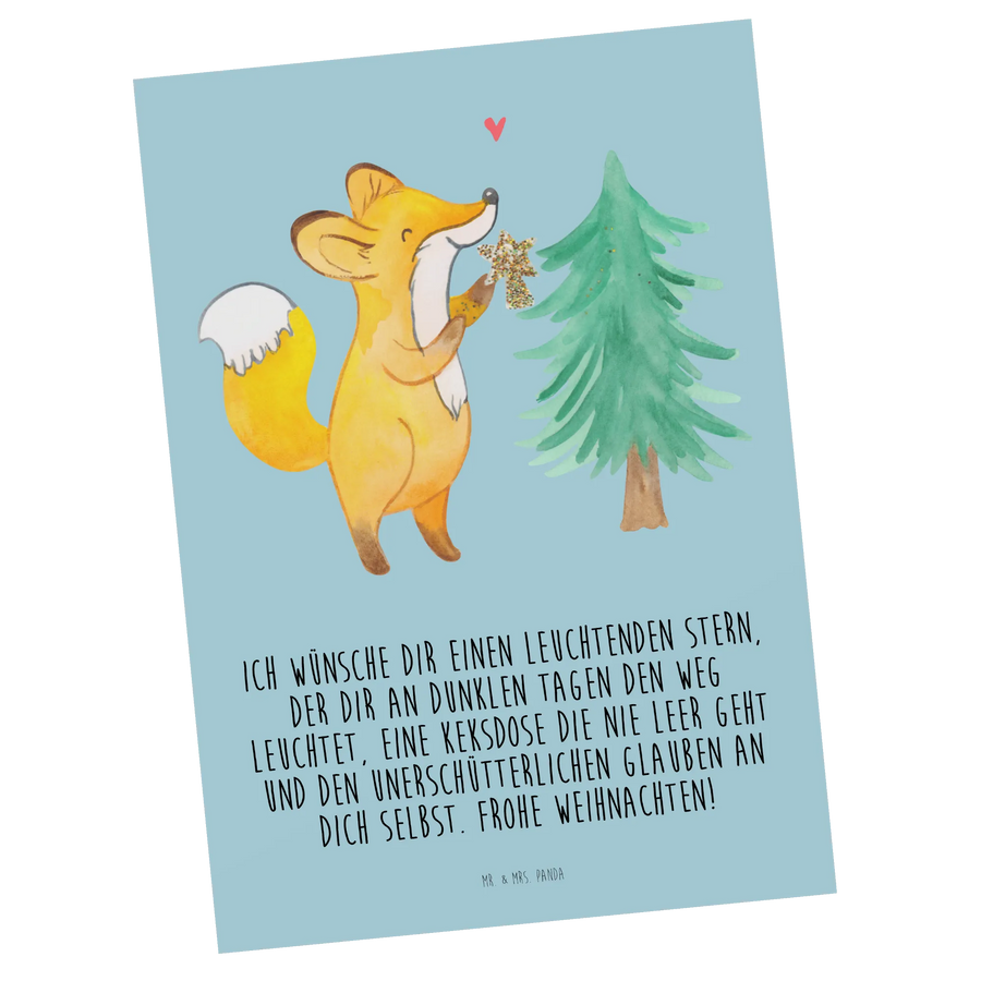 Juhuu – die schönste Zeit des Jahres beginnt! Unsere zauberhafte Postkarte „Fuchs Weihnachtsbaum" aus der Mr. & Mrs. Panda Winter Kollektion fängt genau die warme, verspielte Stimmung von Weihnachten ein. Auf der Vorderseite siehst du einen fröhlichen Fuchs, der einen Tannenbaum schmückt, mit einer goldenen Sternverzierung in seinen Pfoten und einem kleinen roten Herz über dem Kopf. Das eisblaue Hintergrunddesign und die dezenten Verzierungen verleihen der Weihnachtskarte eine gemütliche, winterliche Atmosphäre.