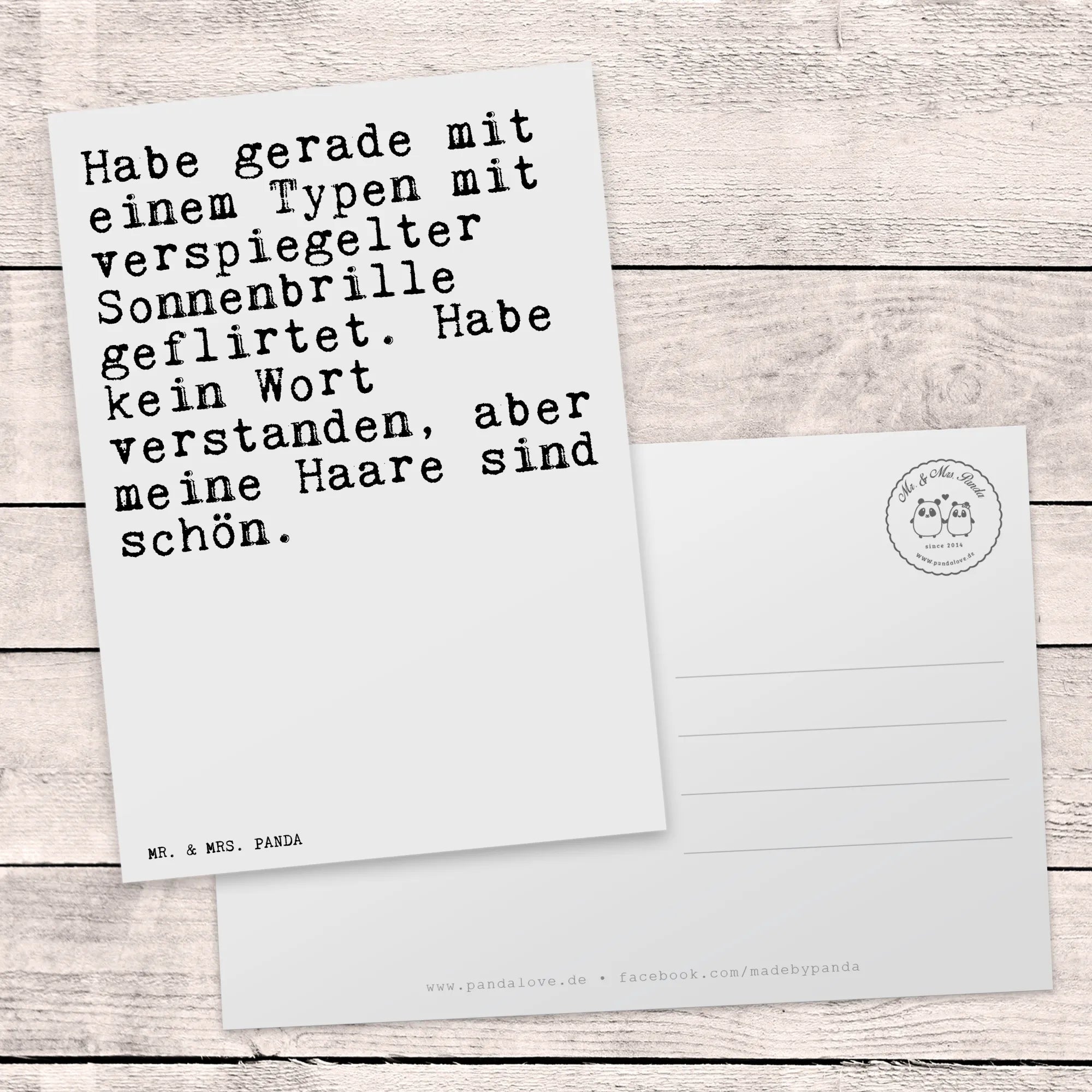 Die wundervolle Postkarte von Mr. & Mrs. Panda mit dem Spruch "Habe gerade mit einem Typen mit verspiegelter Sonnenbrille geflirtet. Habe kein Wort verstanden, aber meine Haare sind schön." ist mehr als nur eine einfache Grußkarte. Sie eignet sich perfekt als Geschenk für deine beste Freundin, deine Schwester oder jede Frau, die einen besonderen Anlass feiert. Diese Karte ist ein liebevoll gestaltetes Statement, das mit einem witzigen Zitat aus der Spruchreif Kollektion macht sie jede Botschaft zu etwas Besonderem.