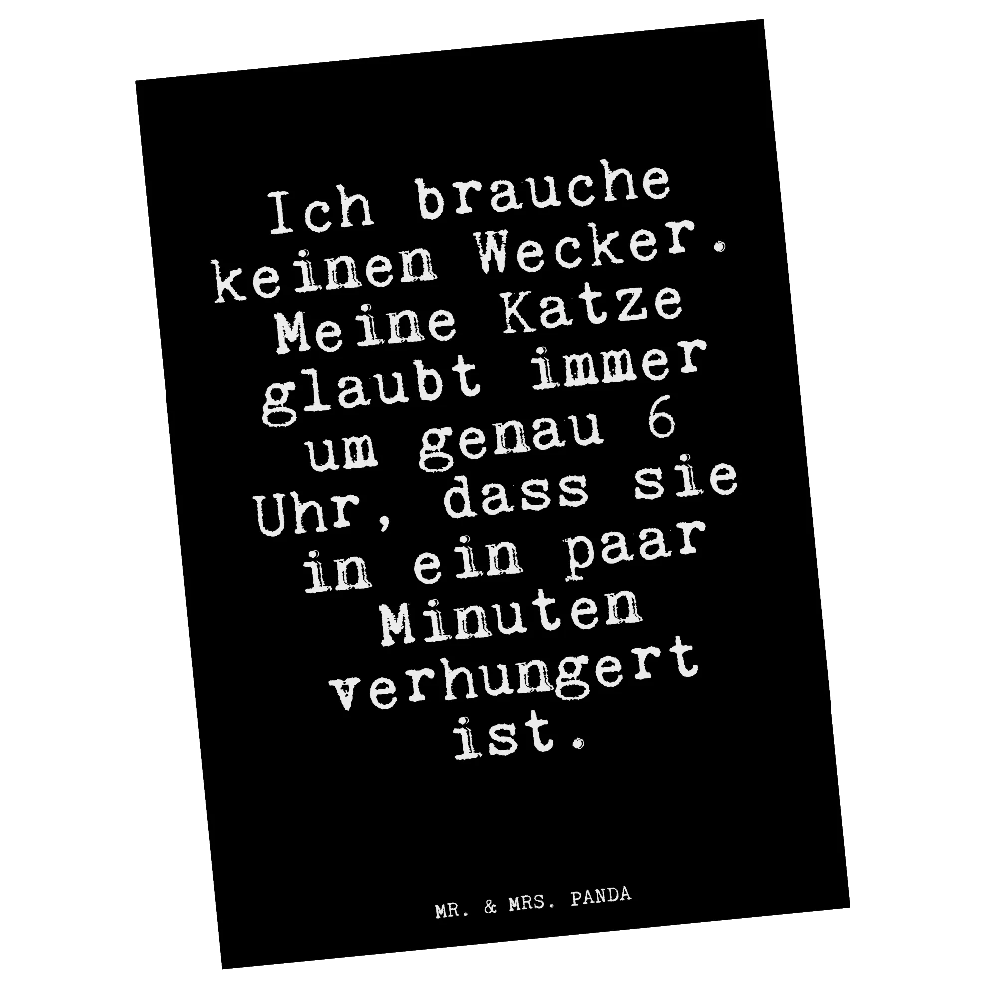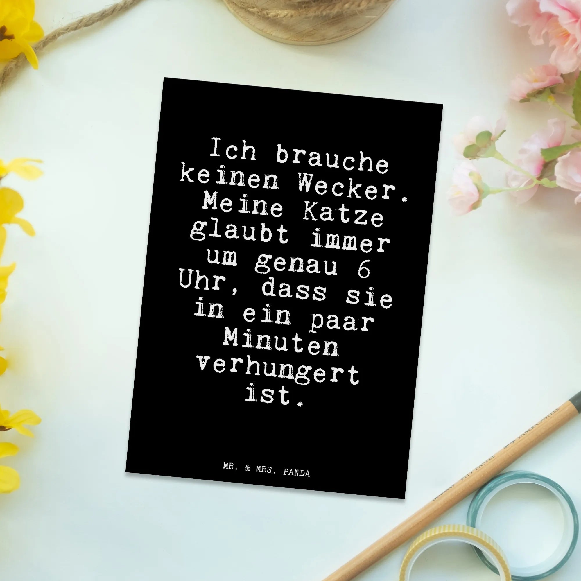 Die einzigartige Postkarte von Mr. & Mrs. Panda mit dem witzigen Motto "Ich brauche keinen Wecker. Meine Katze glaubt immer um genau 6 Uhr, dass sie in ein paar Minuten verhungert ist." ist die perfekte Geschenkidee für alle Katzenliebhaber und Katzenfreunde! Diese charmante Postkarte bringt ein Lächeln in den Alltag und eignet sich hervorragend, um anderen zu zeigen, wie sehr man sie schätzt.