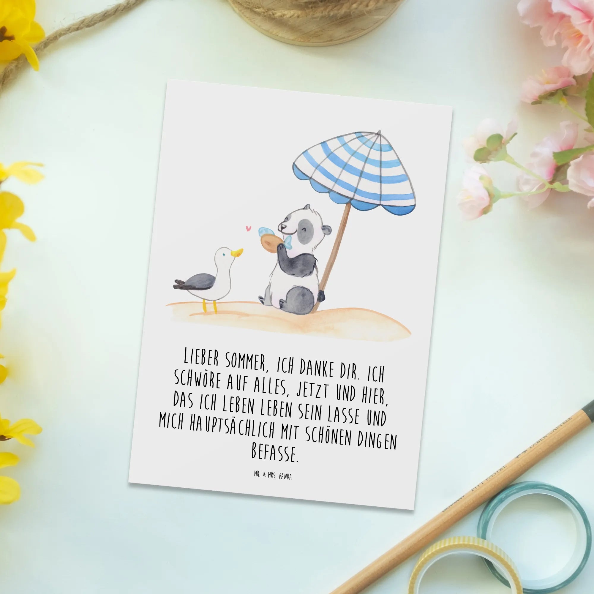 Der hochwertige Karton und der langanhaltende Druck garantieren, dass deine Karte in Erinnerung bleibt. Lass den Sommer in dein Leben und teile die Freude mit deinen Freunden und Familie – die Mr. & Mrs. Panda Postkarte Sommer ist genau das, was du dazu brauchst!