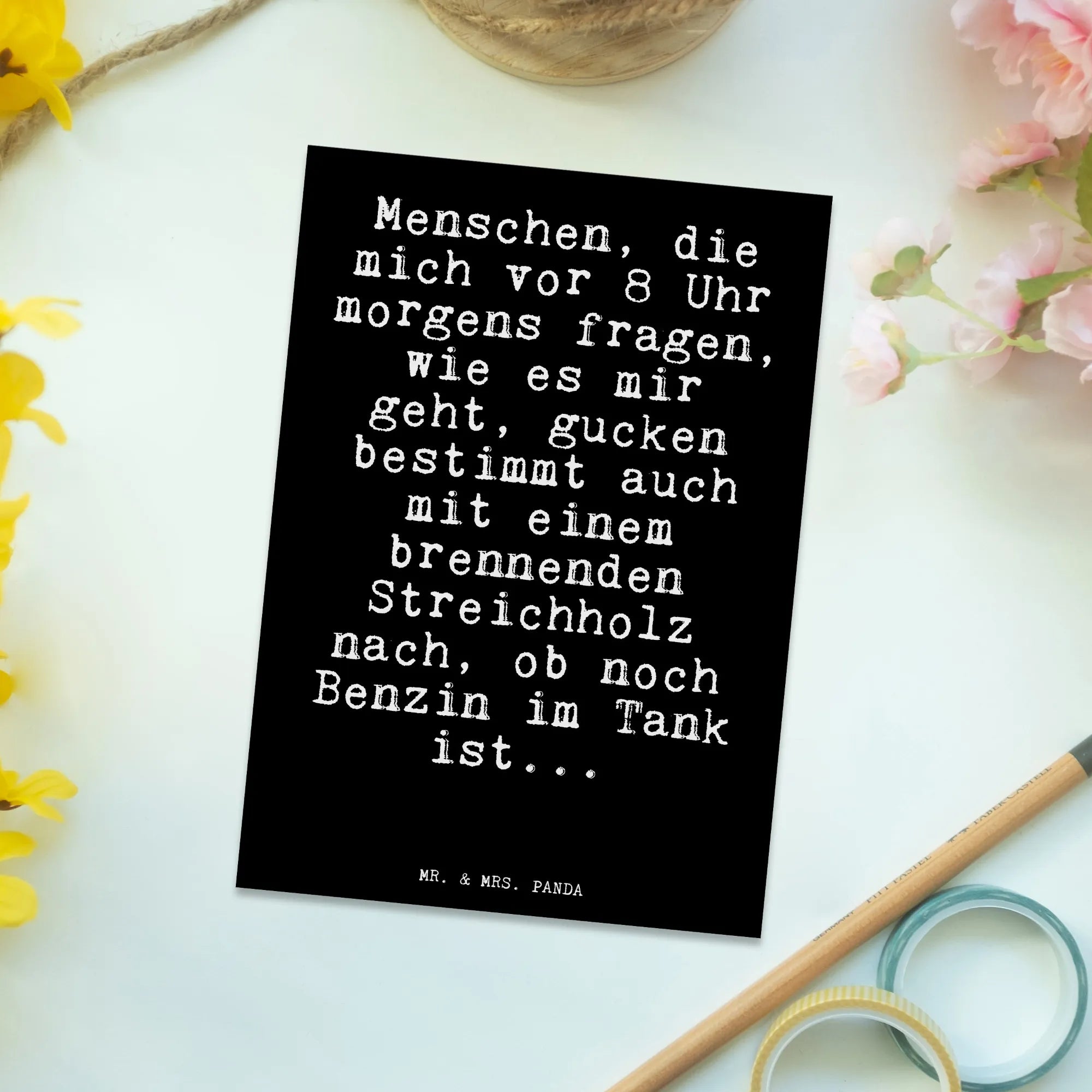 Diese wunderschöne Postkarte von Mr. & Mrs. Panda ist genau das richtige Geschenk für alle Morgenmuffel! Mit dem witzigen Spruch 'Menschen, die mich vor 8 Uhr morgens fragen, wie es mir geht, gucken bestimmt auch mit einem brennenden Streichholz nach, ob noch Benzin im Tank ist...' zaubert sie jedem ein Lächeln ins Gesicht und bringt schwungvoll Farbe in den Büroalltag.