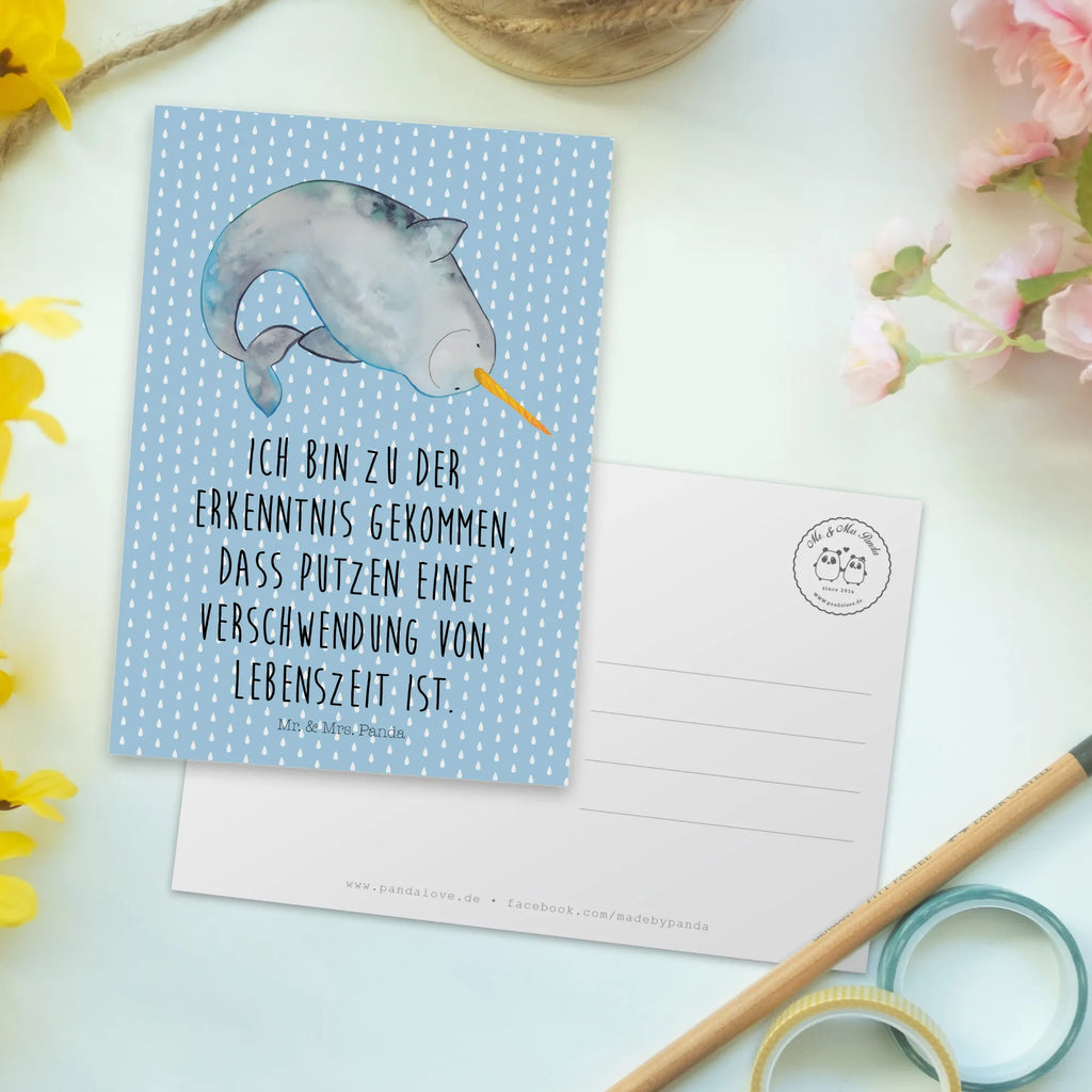 Die Postkarte mit dem niedlichen Narwal von Mr. & Mrs. Panda ist das perfekte Geschenk für alle, die das Meer und seine wundervollen Kreaturen lieben! Mit einem charmanten Design und dem witzigen Spruch 'Ich bin zu der Erkenntnis gekommen, dass Putzen eine Verschwendung von Lebenszeit ist.', eignet sich diese Karte hervorragend für verschiedene Anlässe. Ob du deinen Freunden eine liebe Nachricht schicken, einen Geburtstag feiern oder einfach nur ein Lächeln auf das Gesicht eines lieben Menschen zaubern möchtest – diese Grußkarte ist immer die richtige Wahl.