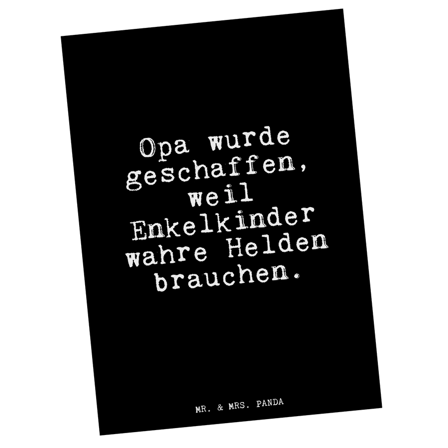 Die liebevolle Postkarte von Mr. & Mrs. Panda ist das perfekte Geschenk für jeden Opa, denn die Botschaft "Opa wurde geschaffen, weil Enkelkinder wahre Helden brauchen." spricht direkt das Herz aller Enkelkinder an. Ideal für Anlässe wie Geburtstage, Dankeschöns oder einfach nur um zu zeigen, wie wichtig der Opa ist!