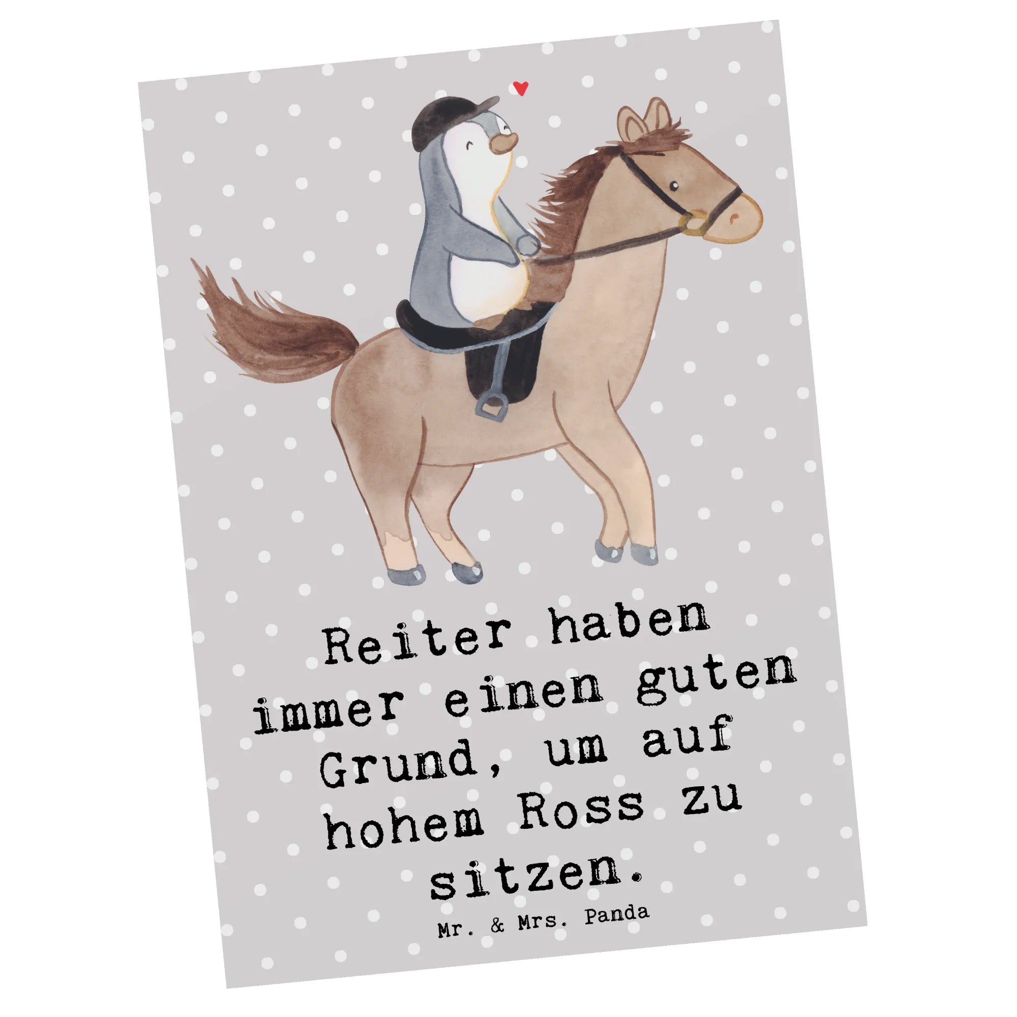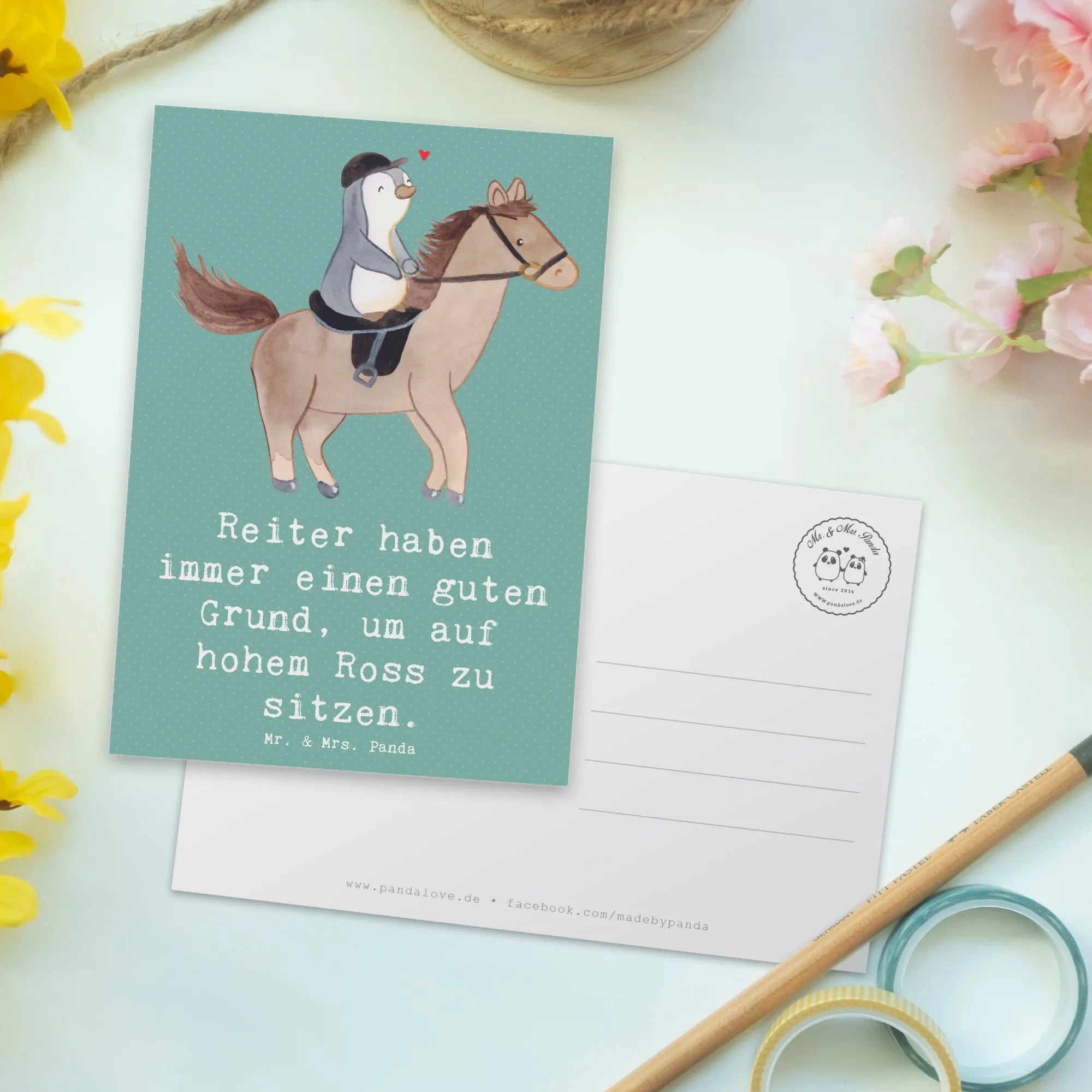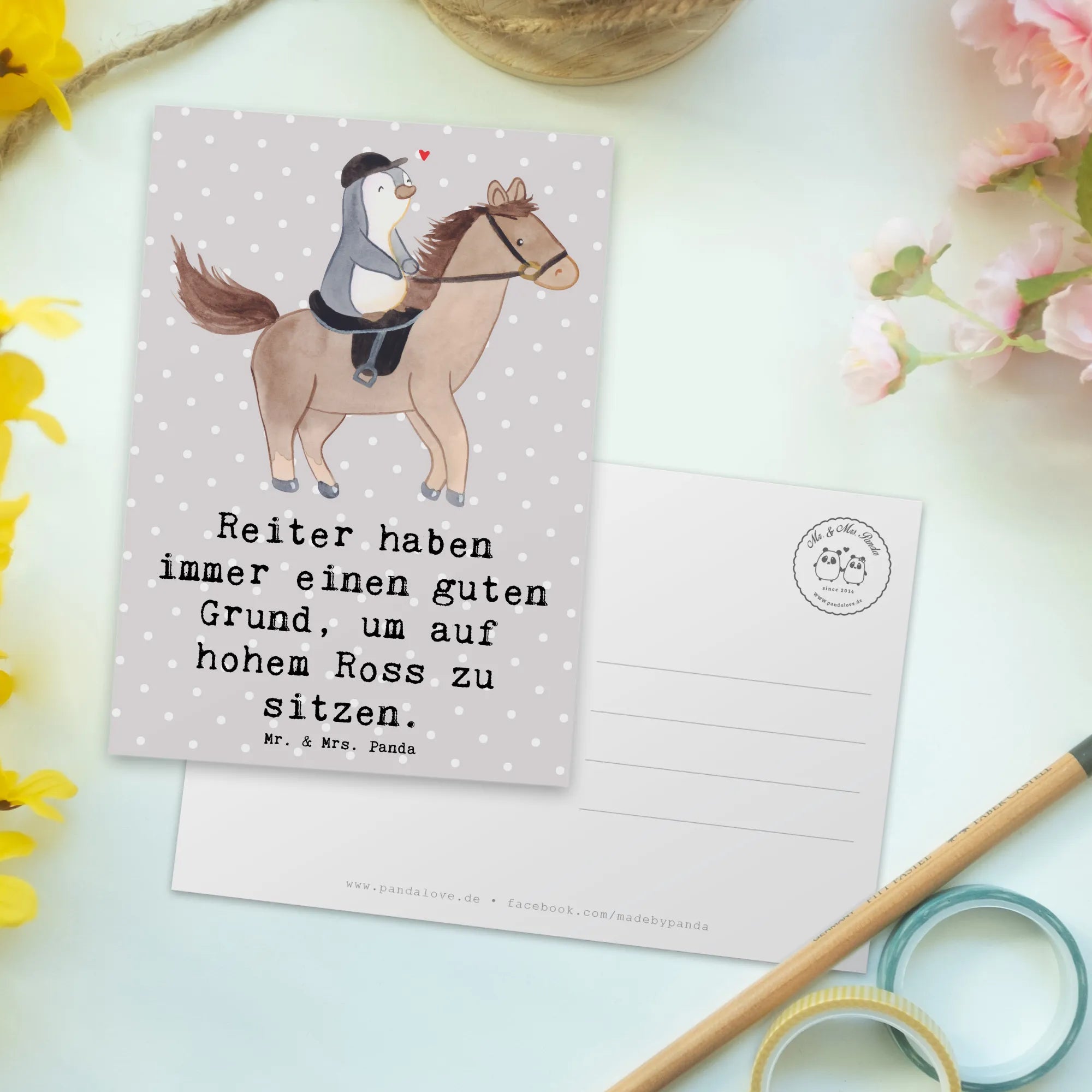 Entdecke die ganz besondere Postkarte Reitsport von Mr. & Mrs. Panda, die das Herz eines jeden Pferdefans höherschlagen lässt! Mit dem liebevollen Slogan „Reiter haben immer einen guten Grund, um auf hohem Ross zu sitzen“ sorgt diese Karte für Schmunzeln und Freude. Sie eignet sich perfekt, um einen Geburtstag, eine Einladung oder einfach nur einen herzlichen Gruß an Freunde und Familie zu gestalten. Die freundlichen, handgezeichneten Motive fangen die Faszination des Reitsports gekonnt ein und machen diese Karte zu einem einzigartigen Geschenk!