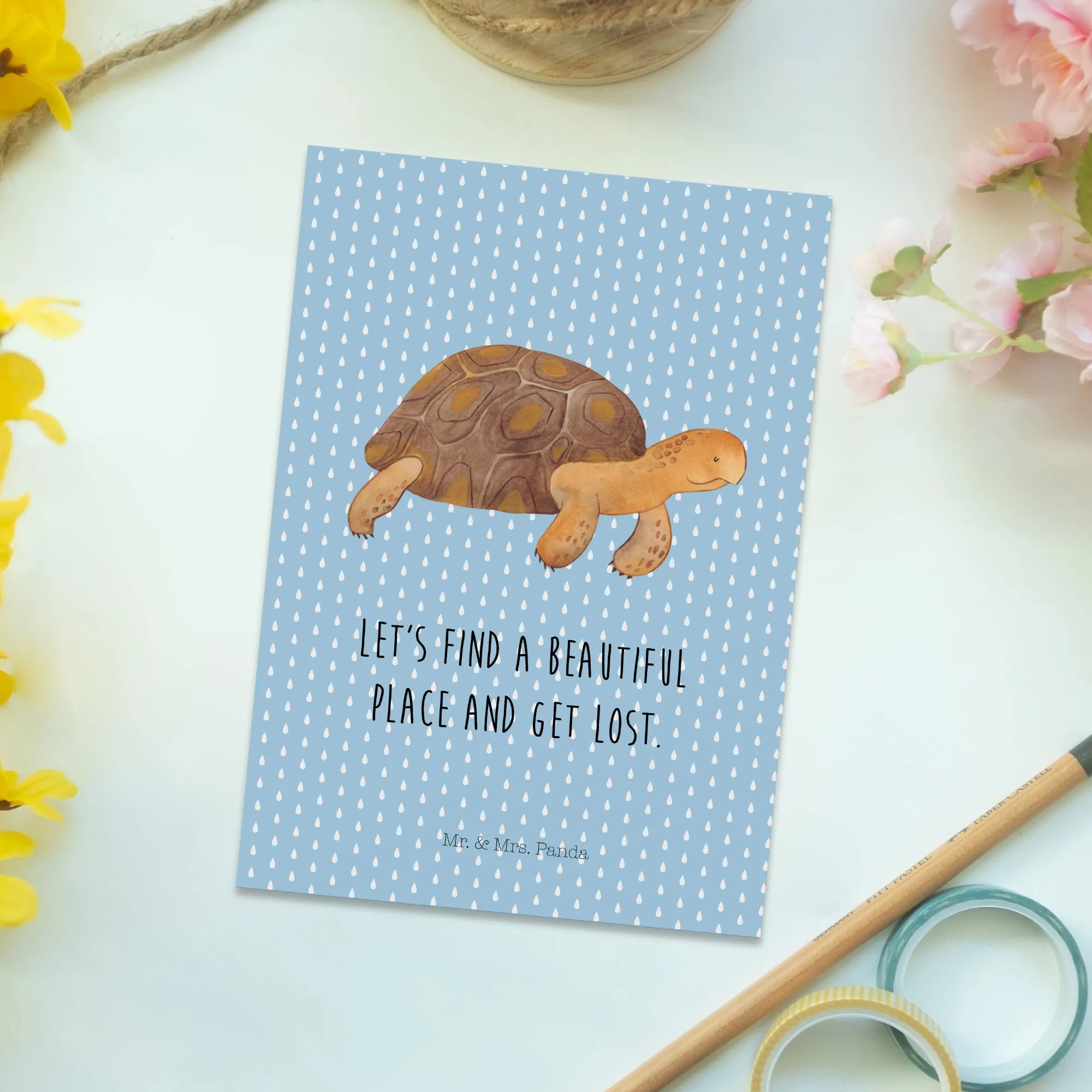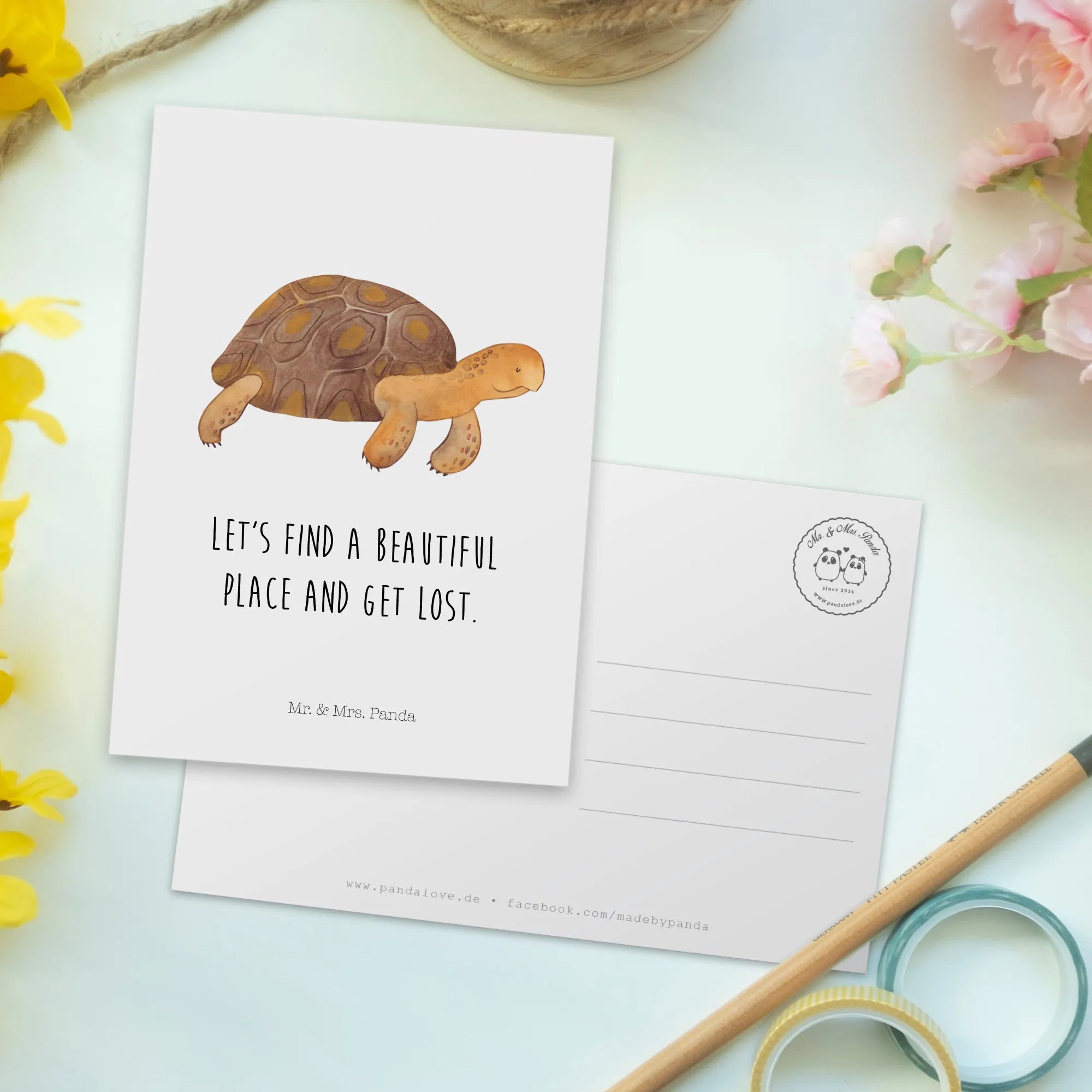 Entdecke die bezaubernde Postkarte "Schildkröte marschiert" aus der hochwertigen Meerestiere Kollektion von Mr. & Mrs. Panda. Diese einzigartige Postkarte ist perfekt für alle, die das Abenteuer und die Reise im Herzen tragen. Die Schildkröte auf der Karte erinnert uns daran, dass wir uns Zeit nehmen sollen, um die schönen Momente des Lebens zu genießen. Mit dem charmanten Slogan "Let's find a beautiful place and get lost." lädt sie dazu ein, sich auf neue Abenteuer einzulassen.