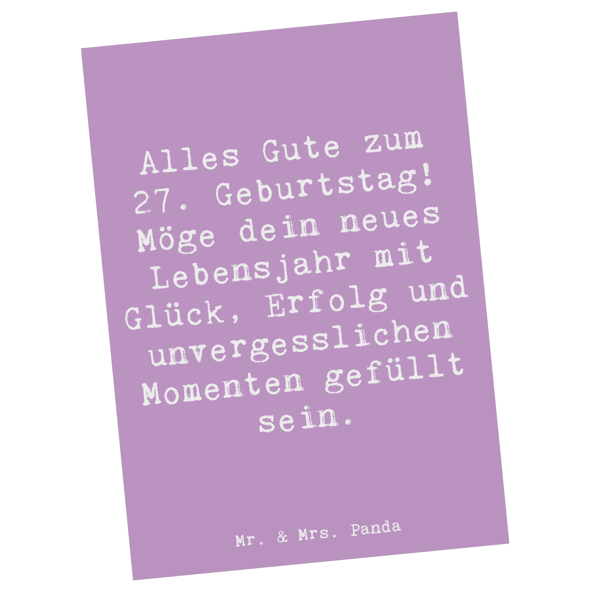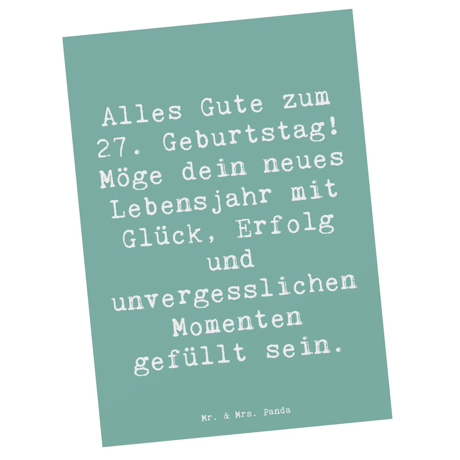 Die einzigartige Postkarte von Mr. & Mrs. Panda zum 27. Geburtstag ist das perfekte Geschenk für deine Lieben, wenn sie diesen besonderen Tag feiern. Egal, ob du für einen Freund, ein Familienmitglied oder einen Kollegen eine liebevolle Geste suchst, diese Karte wird garantiert ein Lächeln auf die Gesichter zaubern! Mit dem herzlichen Spruch "Alles Gute zum 27. Geburtstag! Möge dein neues Lebensjahr mit Glück, Erfolg und unvergesslichen Momenten gefüllt sein." vermittelt sie all die guten Wünsche, die du ausdrücken möchtest.