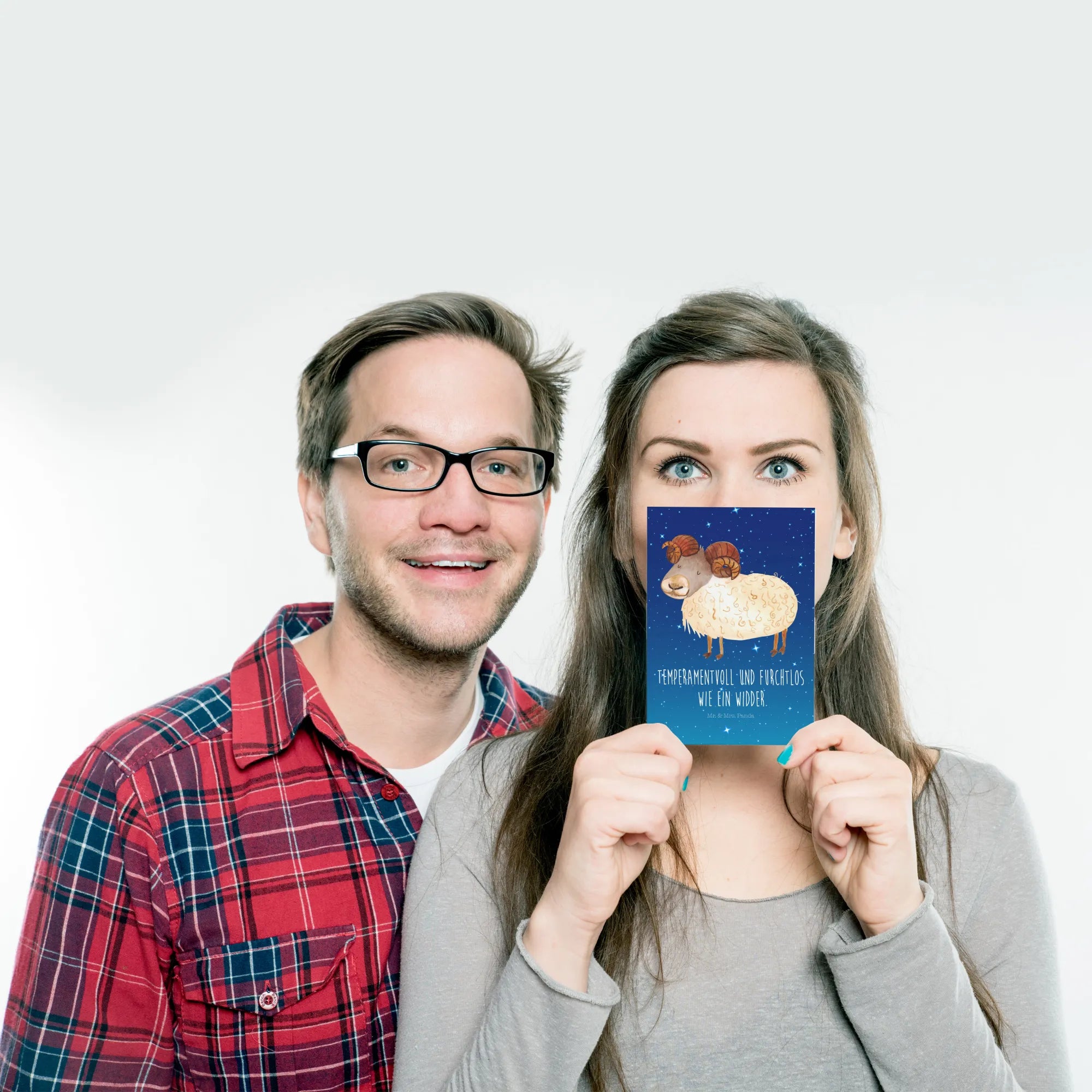 Die einzigartige Postkarte mit dem Motiv Sternzeichen Widder von Mr. & Mrs. Panda ist das perfekte Geschenk für alle, die im März oder April Geburtstag haben oder Widder sind. Mit dem witzigen Spruch "Temperamentvoll und furchtlos wie ein Widder" bringt diese Grußkarte ein Lächeln auf jedes Gesicht. Egal, ob du sie als Geburtstagskarte, Dankeskarte oder einfach nur als nette Geste verschenken möchtest, sie passt immer!