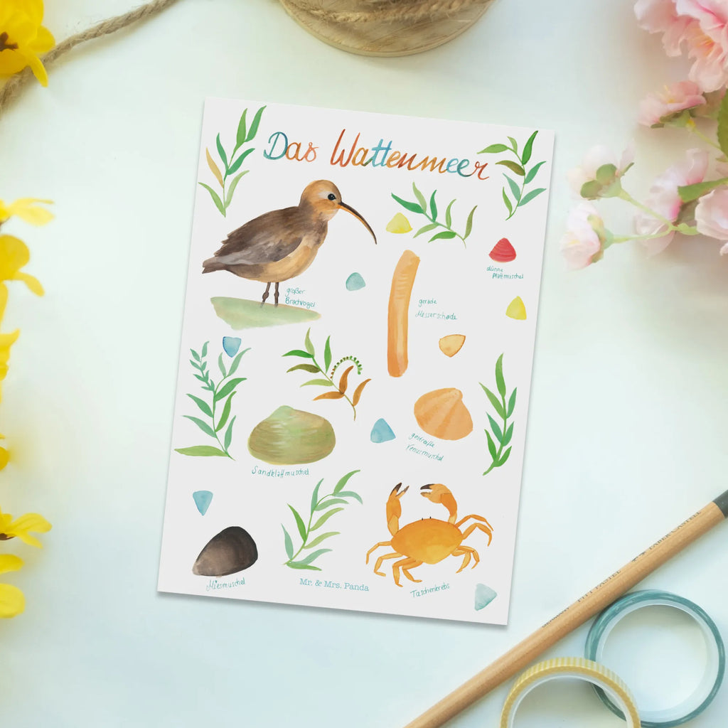 Die wunderschöne Postkarte mit dem Motiv Wattenmeer aus der besonderen Kollektion Wild & Free von Mr. & Mrs. Panda ist das perfekte Geschenk für jeden Naturliebhaber! Sie zeigt eine liebevoll handgezeichnete Darstellung des Wattenmeers mit vielen verschiedenen Tieren und Pflanzen, wie dem Großen Brachvogel, dem Seenebelwurm und vielen farbenfrohen Muscheln. Dank des Aquarellstils wirkt die Karte nicht nur hell und einladend, sondern bringt auch ein Stück norddeutsche Küstenlandschaft direkt zu Dir nach Hause.