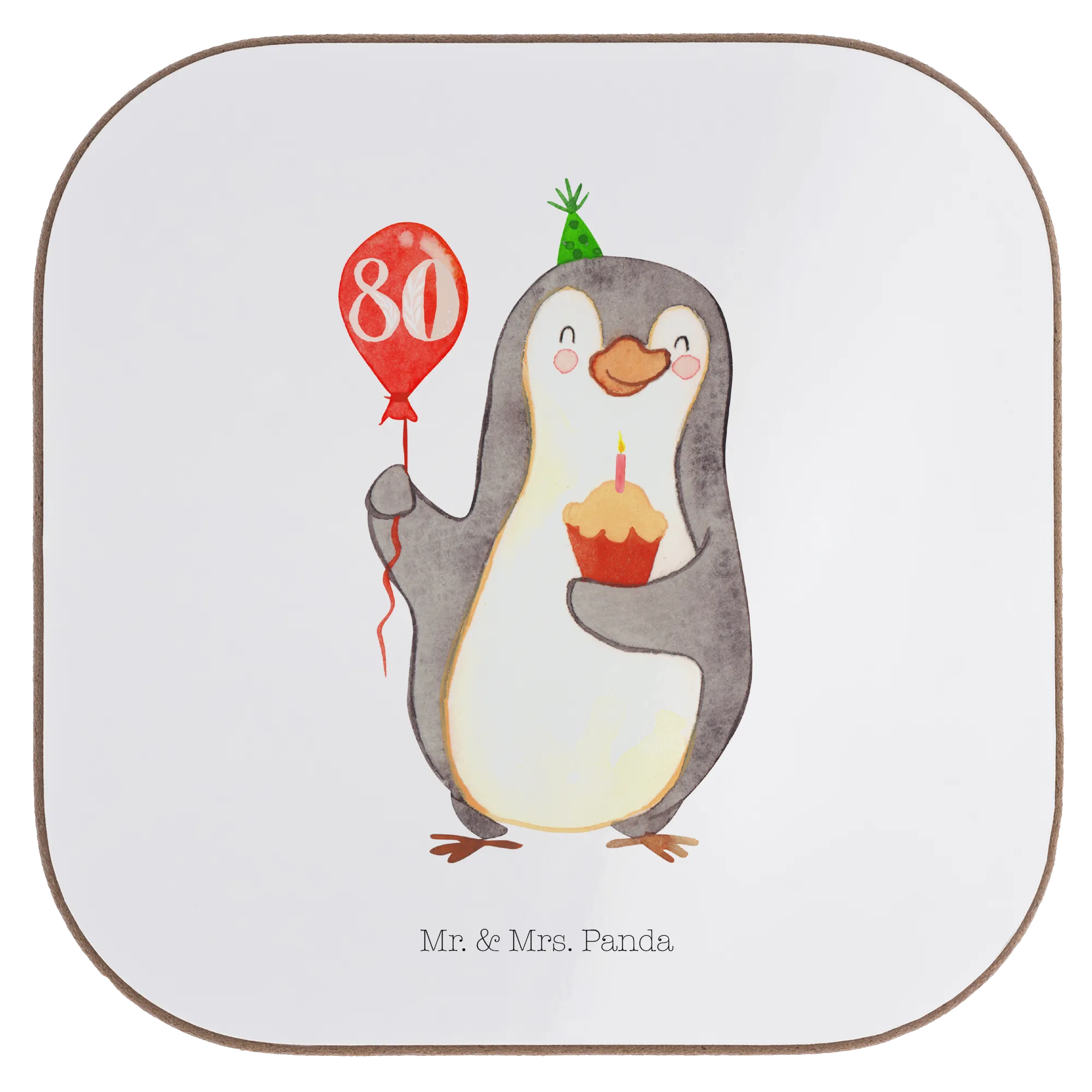 Quadratische Untersetzer 80. Geburtstag Pinguin Luftballon - mit Spruch