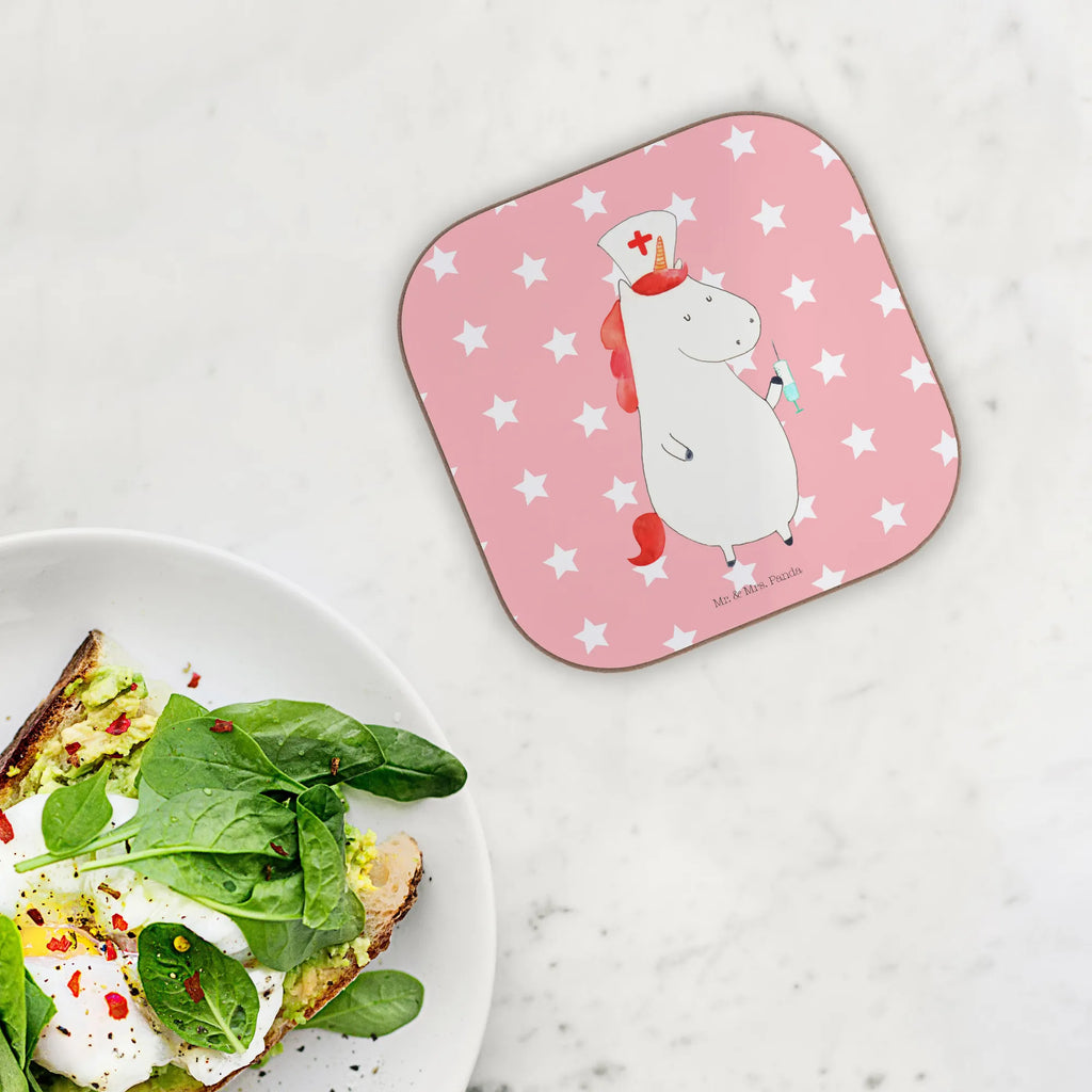 Quadratische Untersetzer Einhorn Krankenschwester - mit Spruch - Rot Pastell