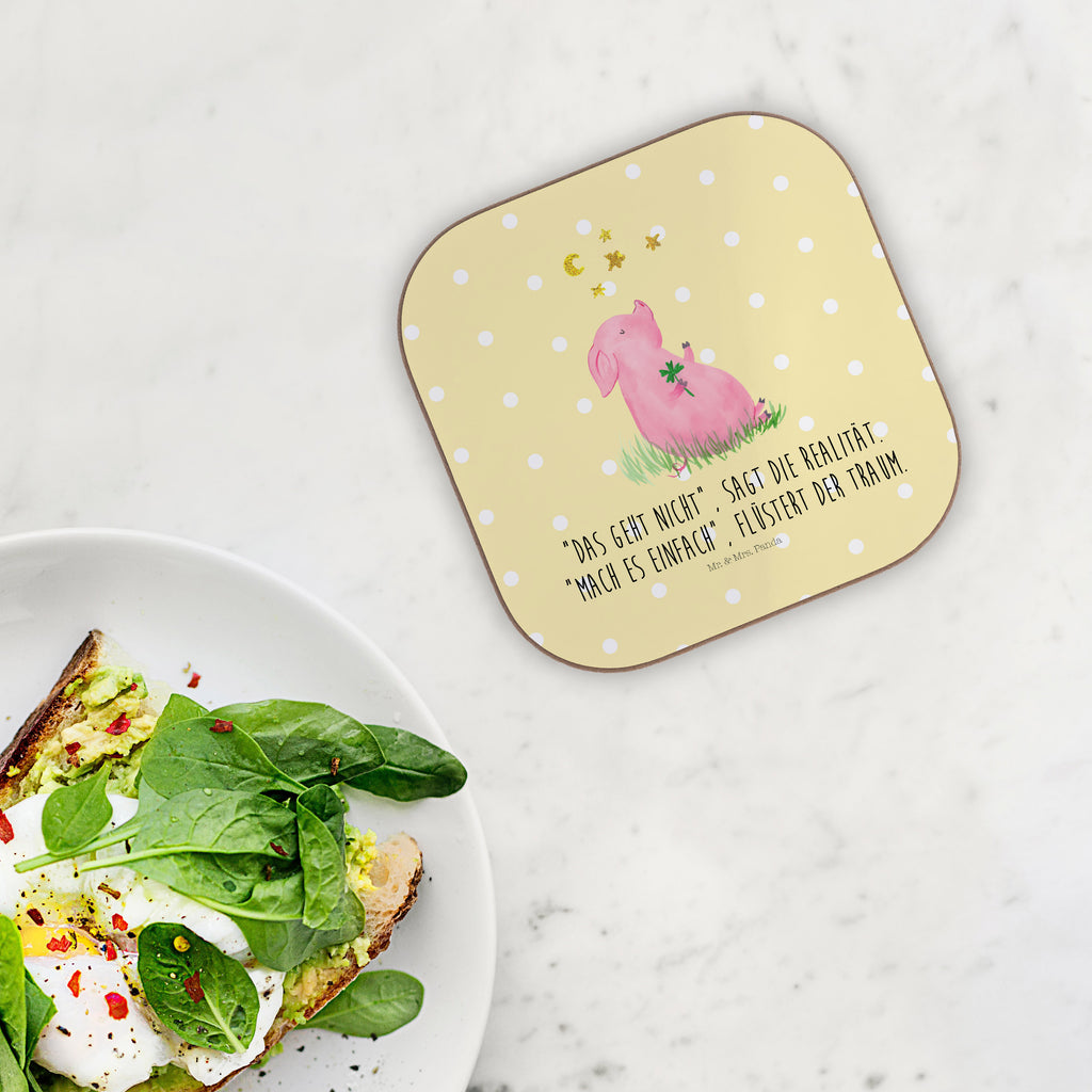 Bist du auf der Suche nach einem ausgefallenen Geschenk für einen besonderen Anlass? Dann ist der Untersetzer mit dem süßen Glücksschwein aus der Small World Kollektion von Mr. & Mrs. Panda genau das Richtige für dich! Dieser wunderschöne quadratische Untersetzer bereichert jeden Ess- oder Couchtisch und sorgt dafür, dass deine Getränke stilvoll präsentiert werden. Der charmante Spruch "Das geht nicht, sagt die Realität. Mach es einfach, flüstert der Traum." inspiriert dazu, die eigenen Ziele und Träume nie aus den Augen zu verlieren.