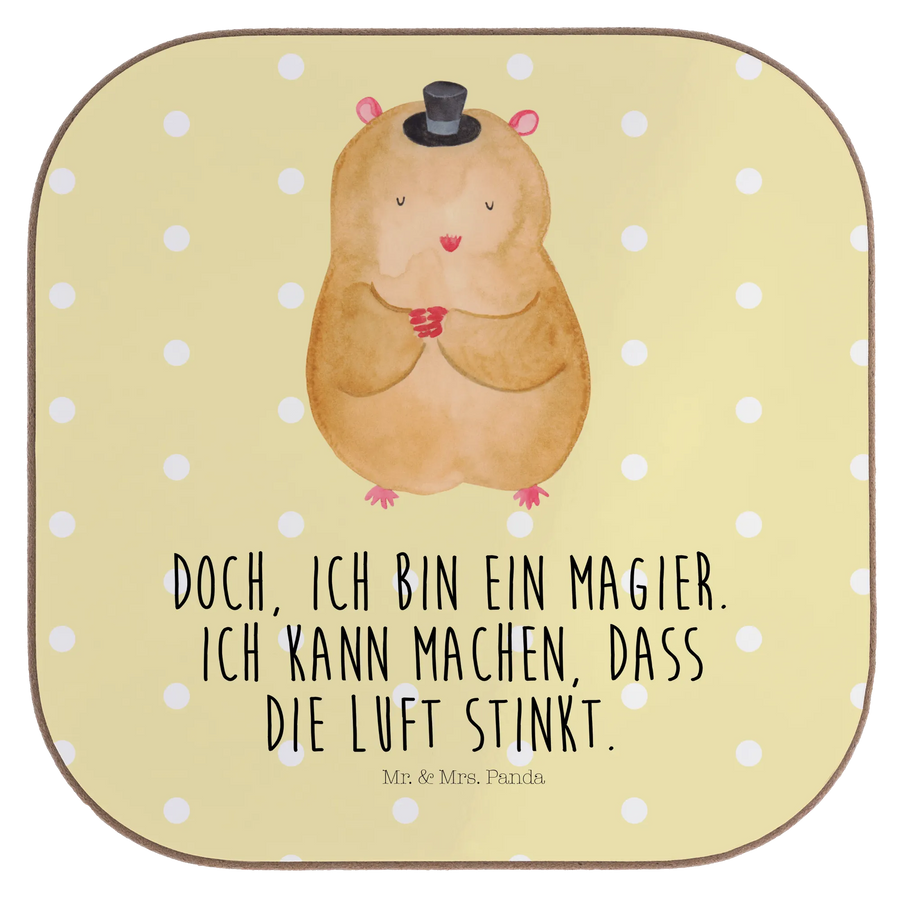 Quadratische Untersetzer Hamster mit Hut - mit Spruch - Gelb Pastell