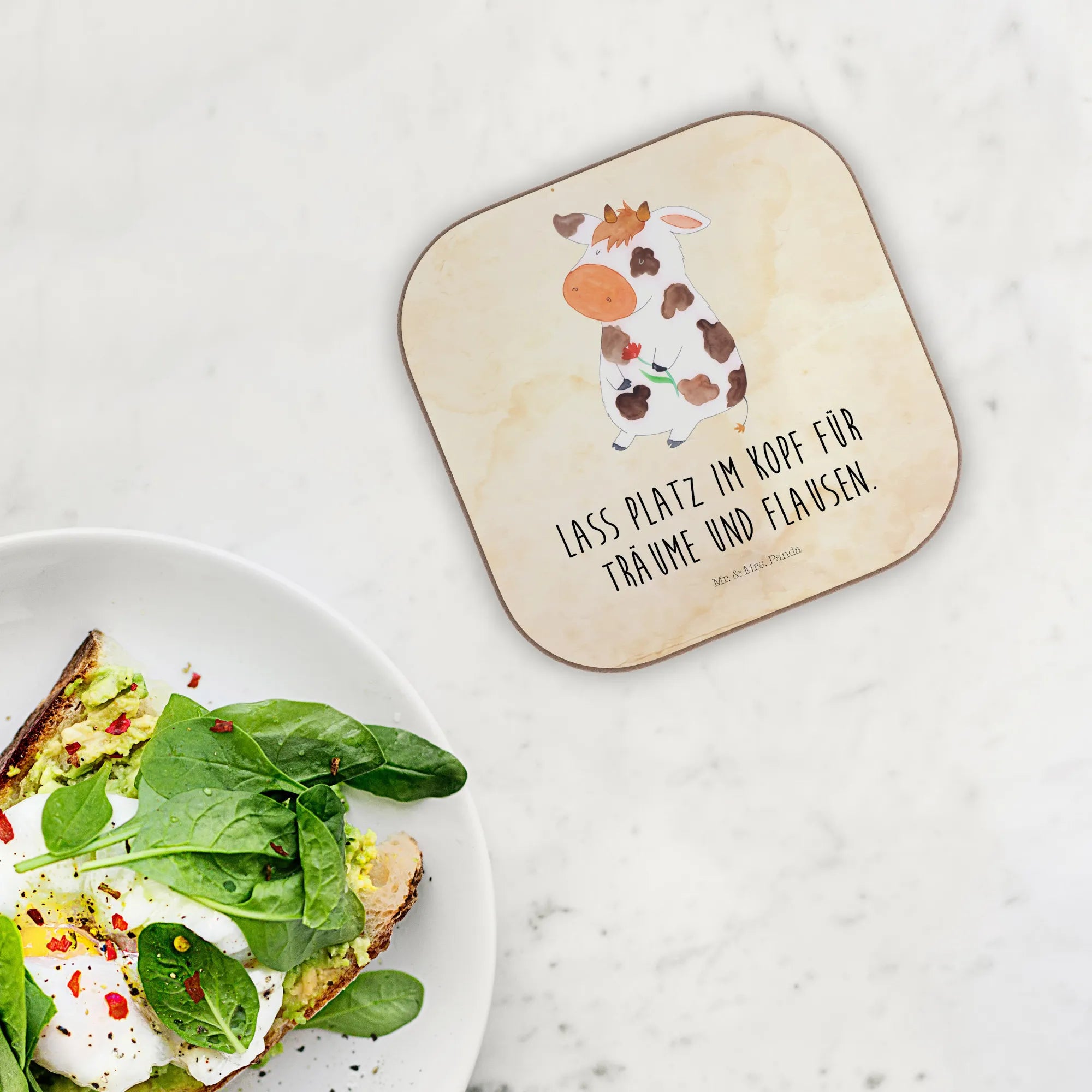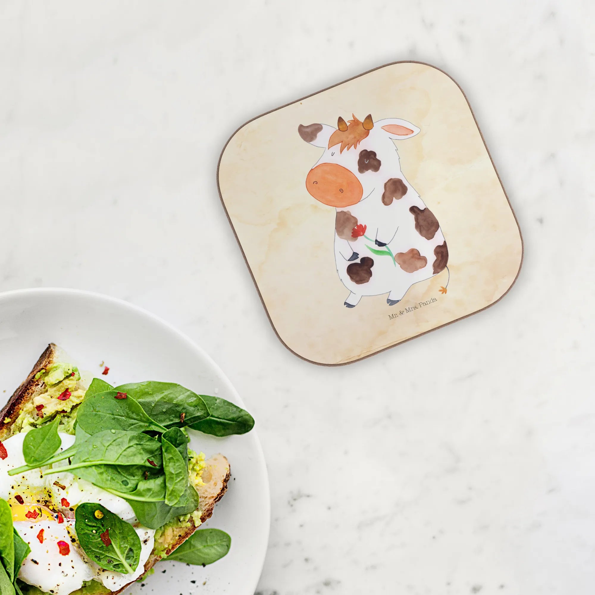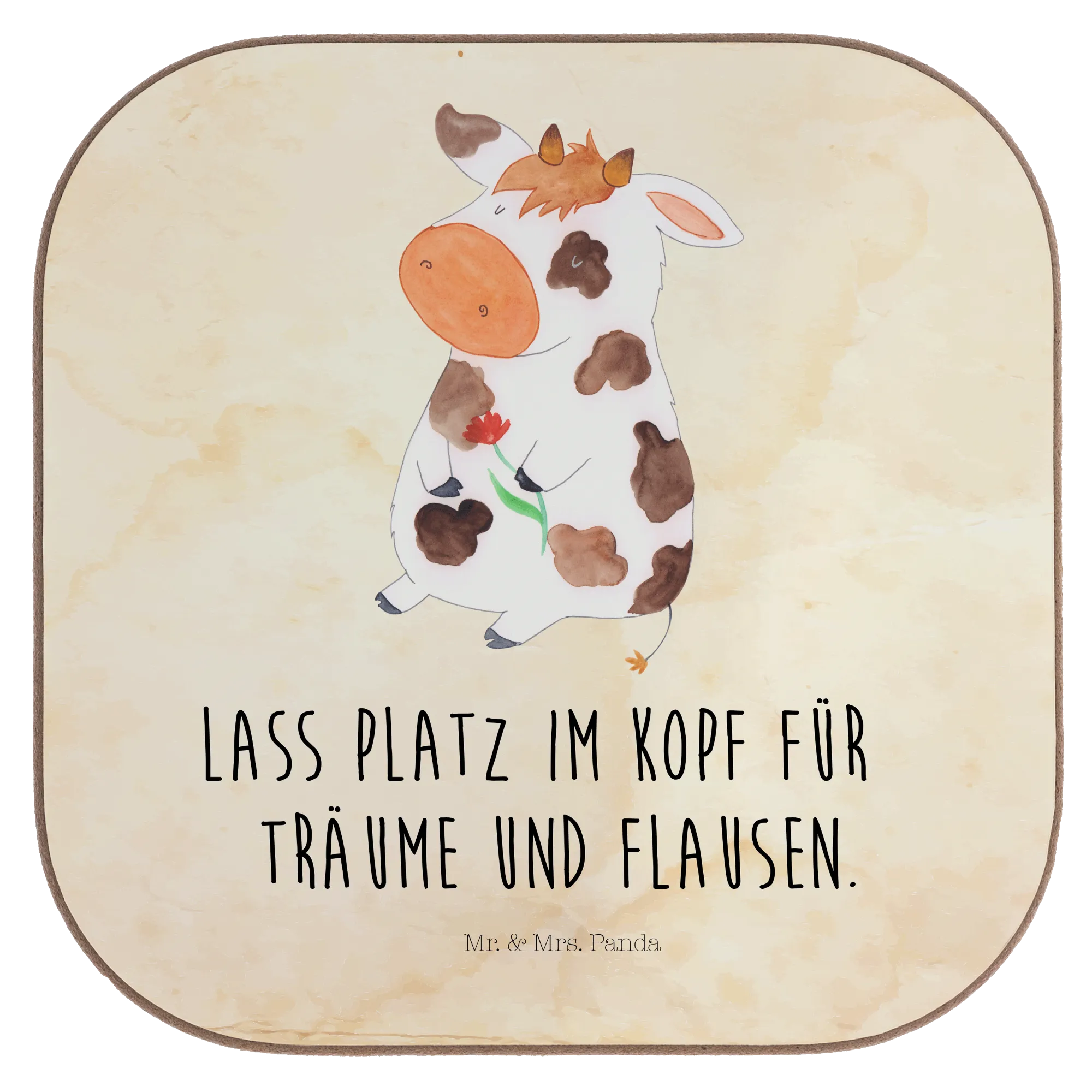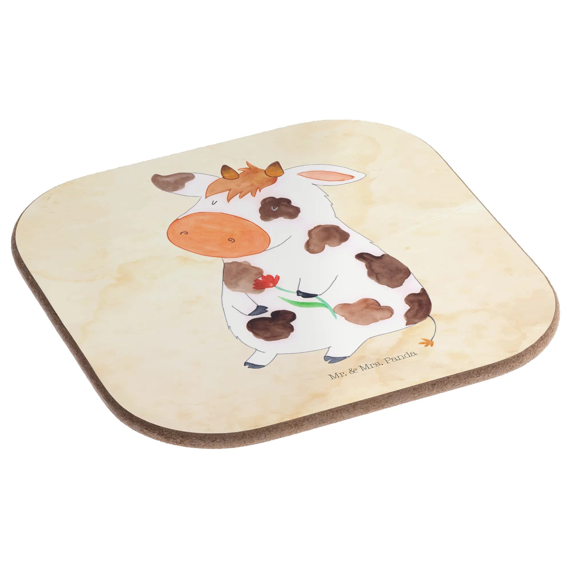 Der perfekte Untersetzer von Mr. & Mrs. Panda - unser wunderschöner quadratischer Untersetzer mit dem niedlichen Kuh-Motiv ist ein absoluter Hit für jeden Tierfreund! Dieser Untersetzer ist nicht nur eine praktische Lösung, um Tischoberflächen vor unschönen Abdrücken und Kratzern zu schützen, sondern bringt charmante Bauernhof-Atmosphäre in dein Zuhause. ❤️ Die kleine, verträumte Kuh, die stolz mit einer Blume in der Hand posiert, bringt Freude und Motivation in jeden Moment.