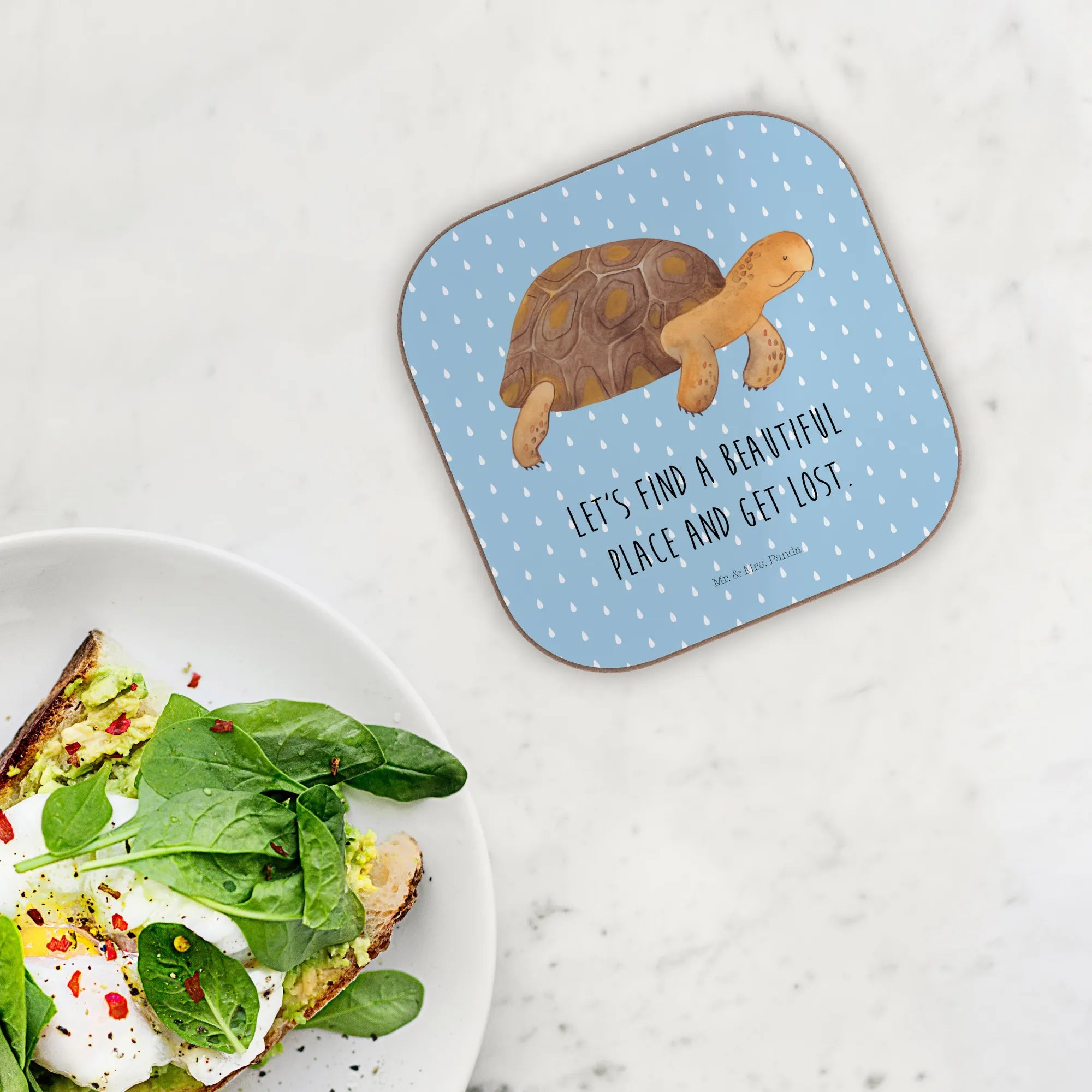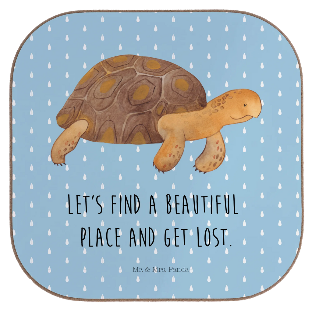 Quadratische Untersetzer Schildkröte marschiert - mit Spruch - Blau Pastell