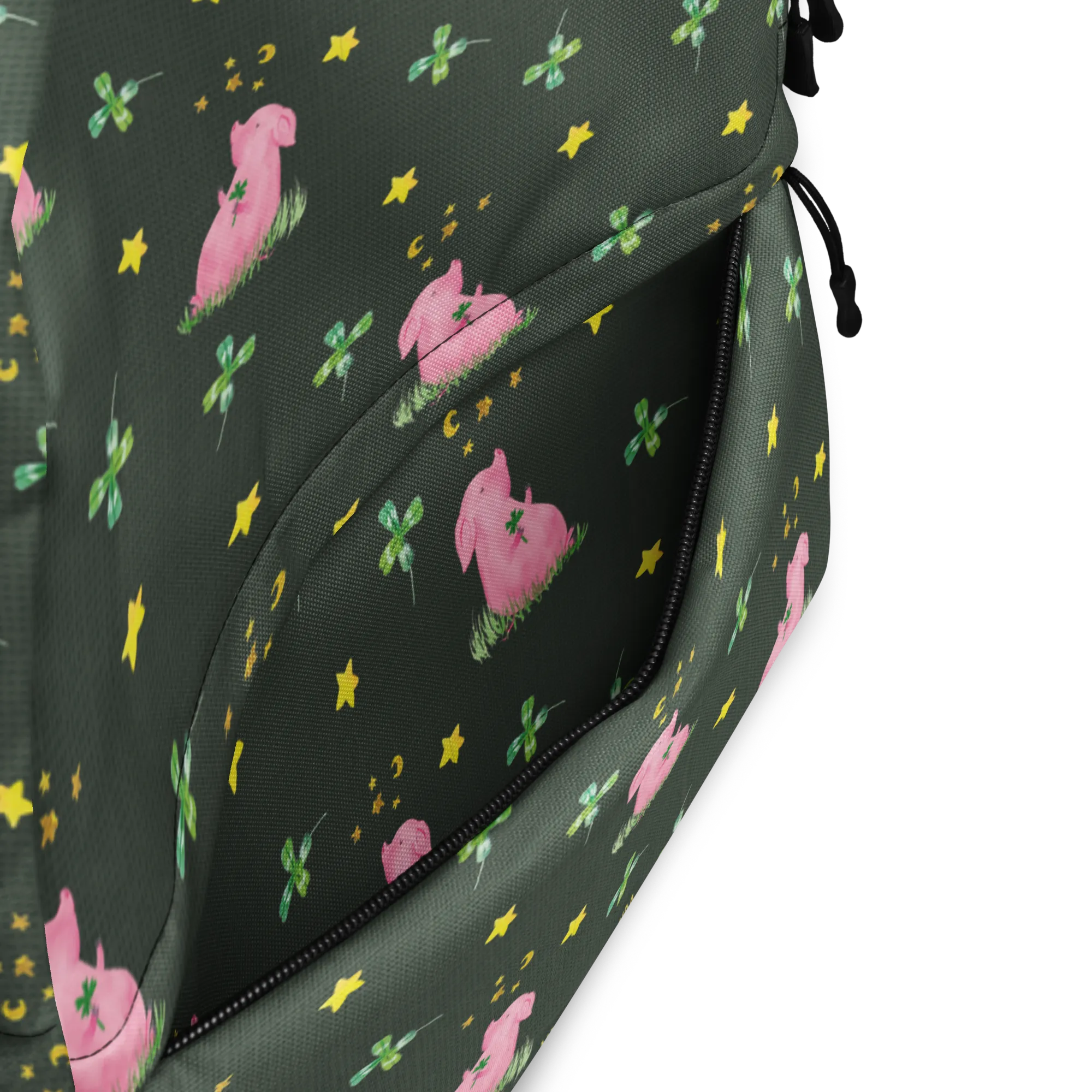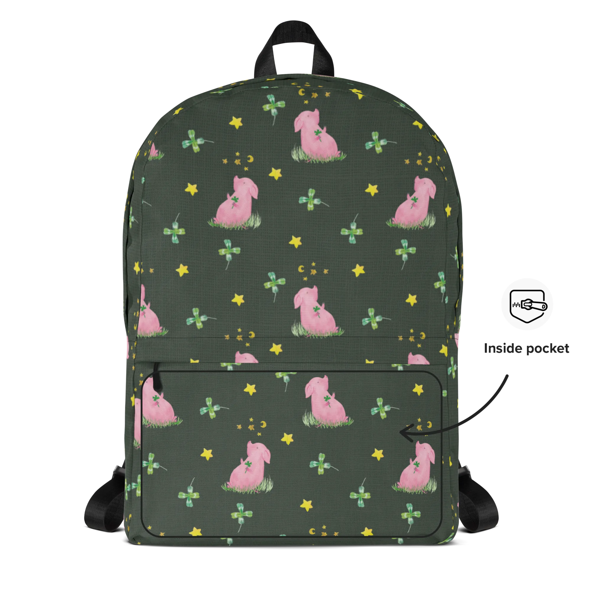 Besonders gut eignet sich dieser Rucksack für all diejenigen, die auf der Suche nach einem Glücksbringer sind – das süße Motiv eines kleinen Schweinchens mit einem Kleeblatt bringt täglich ein Lächeln auf dein Gesicht und erinnert dich daran, deine Träume zu verfolgen.