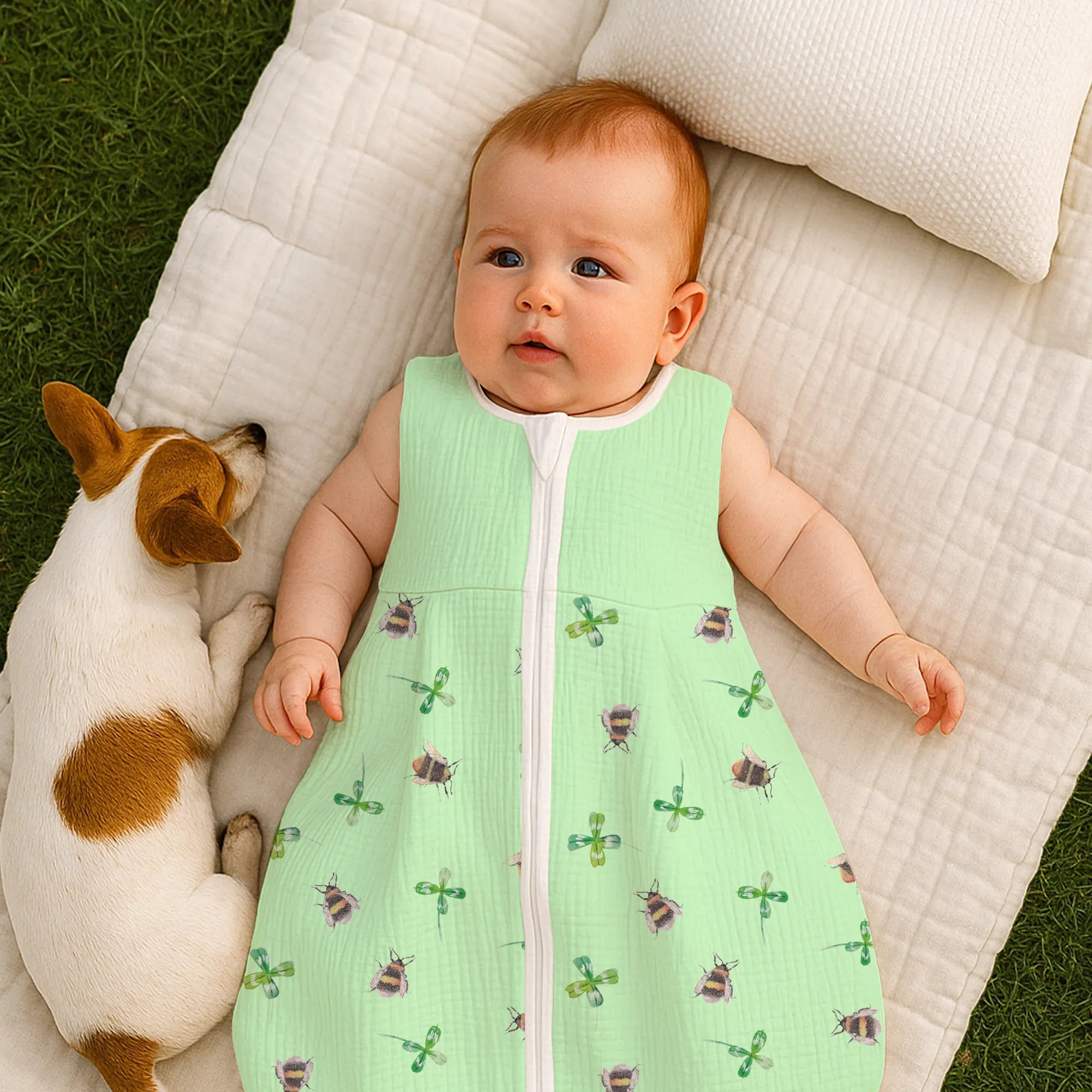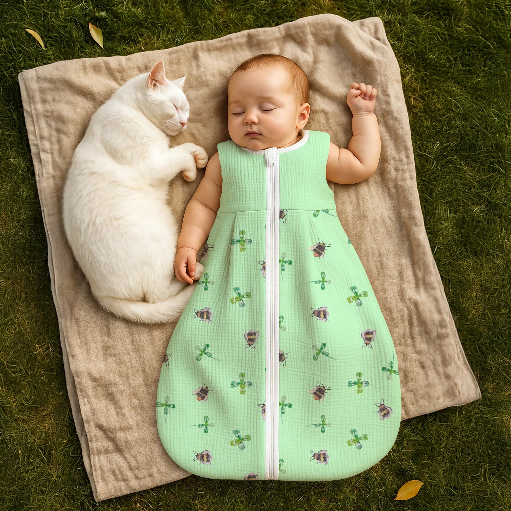 Schenke Nähe, Geborgenheit und ein kleines Stück Glück – mit dem Babyschlafsack „Hummeln mit Kleeblatt“ von Mr. & Mrs. Panda.