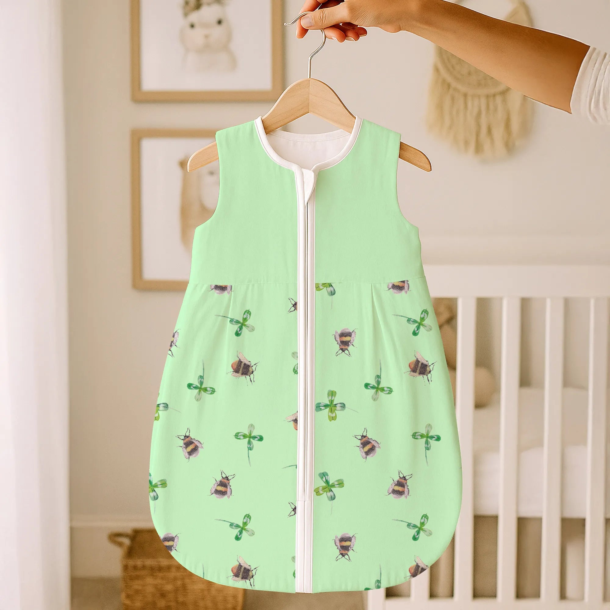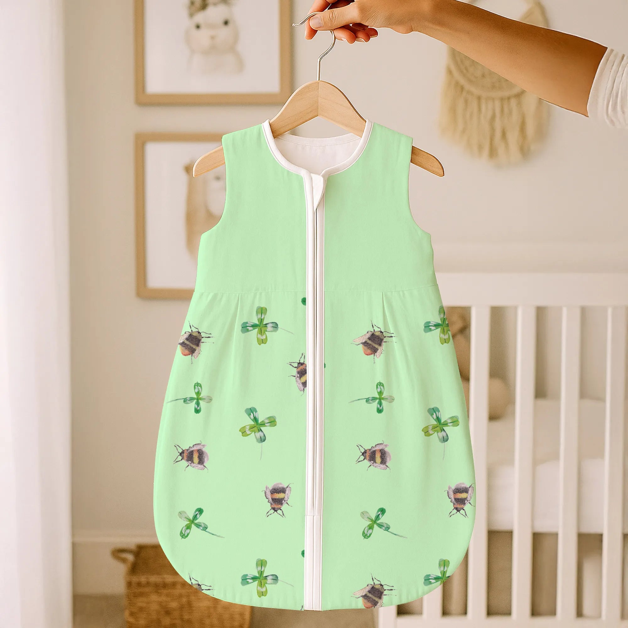 Dieser liebevoll designte Babyschlafsack vereint fröhliche Tiermotive mit einem positiven Spruch und zaubert sofort gute Laune ins Kinderzimmer. Zwei süße Hummeln halten ein Kleeblatt – ein Symbol für Glück und Verbundenheit. Perfekt für alle, die einen Babyschlafsack mit Hummel- oder Bienenmotiv suchen.