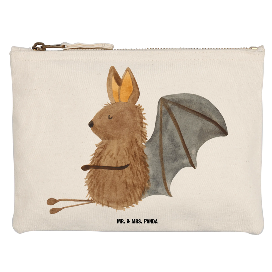 Eine wunderschöne Schminktasche von Mr. & Mrs. Panda: Die Kosmetiktasche "Fledermaus sitzend" aus der liebevollen Small World Kollektion ist ein echter Gute-Laune-Begleiter. Die süße, lächelnde Fledermaus auf hellem Grund zieht alle Blicke auf sich und macht das Einpacken deiner Schminke gleich viel fröhlicher. 😊