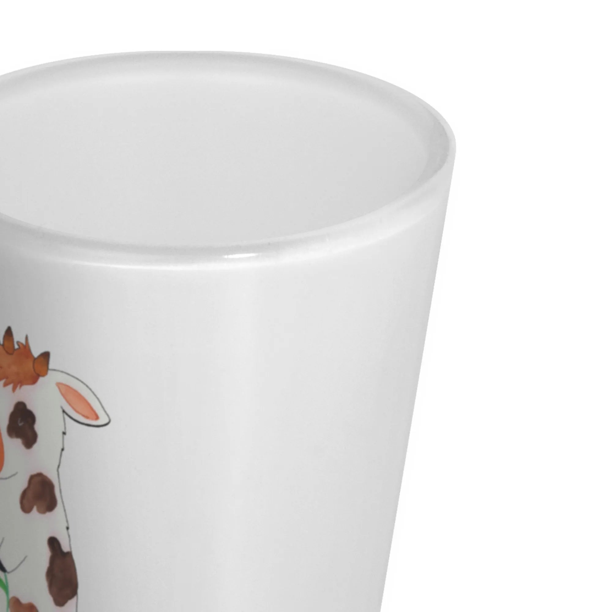 Dieses niedliche Shotglas bringt den Charme des Bauernhofs direkt zu Dir nach Hause. Die verträumte Kuh mit der Blume in der Hand ist von Mrs. Panda liebevoll gezeichnet und wird im brillant glänzenden Vollfarb-Glasdruck auf das Glas gebracht. Das Ergebnis: ein echter Hingucker, der auf jedem Tisch und bei jeder Feier für gute Laune sorgt.