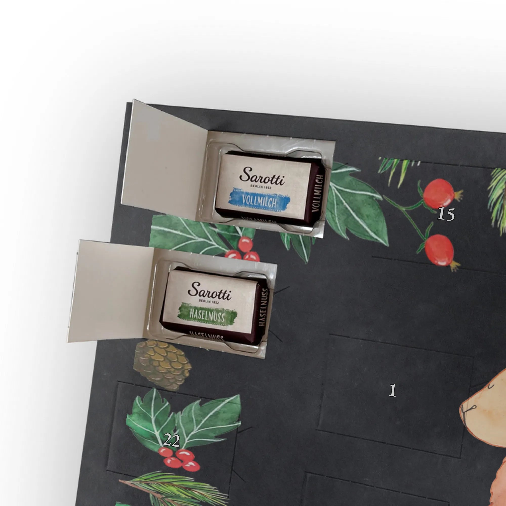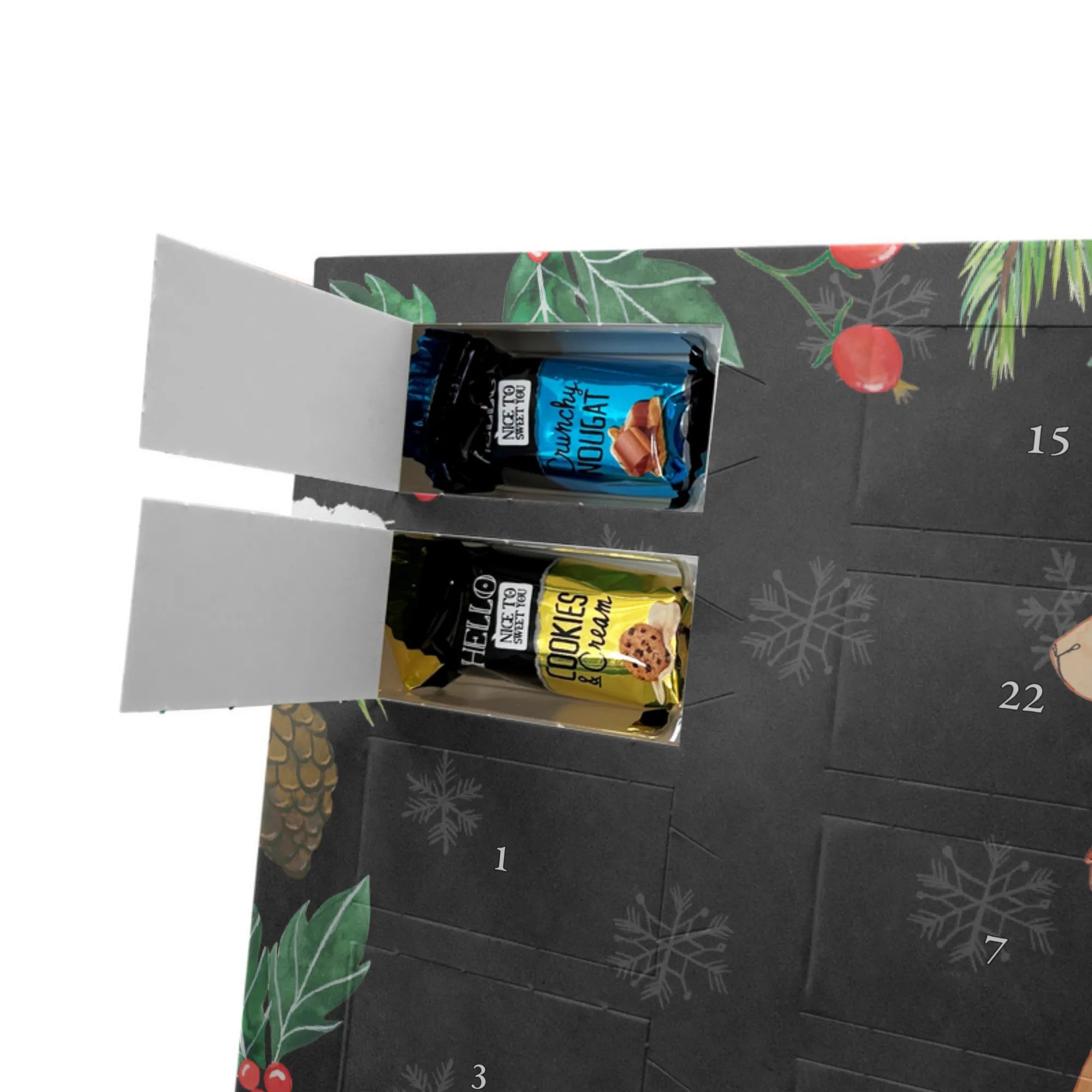 Schon unser Schoko-Adventskalender von Mr. & Mrs. Panda gesehen? Ein liebevoll gestalteter Kalender, bedruckt mit wunderschönen Motiven & Sprüchen, der deine Adventszeit versüßt. Der Kalender ist nicht personalisierbar, überzeugt aber durch brillante Druckqualität mit seidenmatter Oberflächenveredelung und bedruckte Seitenflächen für ein rundum schönes Erscheinungsbild. Maße: 325 mm x 225 mm x 27 mm. Du kannst ihn aufhängen oder aufstellen – ganz wie es dir gefällt. Gefüllt mit Ritter Sport Schokowürfeln in köstlichen Sorten: Mousse au Chocolat, Schoko Crisp, Voll-Nuss in Nougatcreme, Karamell Duo, Joghurt und Erdbeer-Joghurt. Bitte beachten: Es handelt sich um einen Kalender gefüllt mit Ritter Sport Schokolade, nicht um einen Kalender der Marke Ritter Sport. Ob als Geschenk oder für dich selbst – dieser Schoko-Adventskalender bringt täglich kleine Glücksmomente und süße Überraschungen.