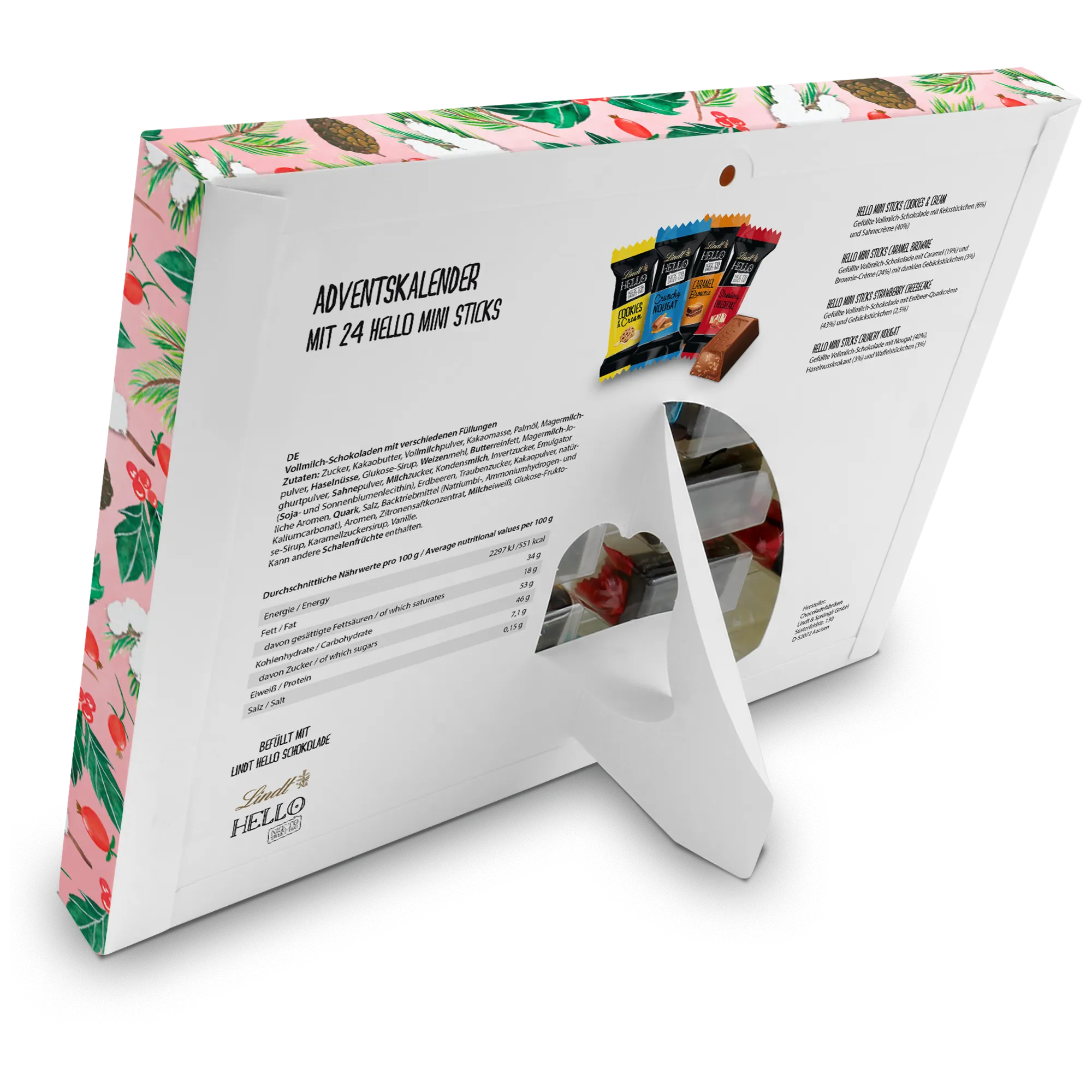 Entdecke den charmanten Schokoladen Adventskalender von Mr. & Mrs. Panda – ein kleines Kunstwerk für alle Schoko-Liebhaber. Der Schoko-Adventskalender ist mit liebevollen Illustrationen und kurzen Sprüchen bedruckt und verbreitet gemütliche Vorfreude auf Weihnachten. Er ist nicht personalisierbar, aber durch die brillante Druckqualität und die seidenmatte Oberflächenveredelung ein echtes Hingucker-Produkt. Auch die Seitenflächen sind bedruckt, was dem Kalender ein rundum schönes Erscheinungsbild verleiht. Maße: 325 mm x 225 mm x 27 mm. Das praktische Design erlaubt es, den Kalender aufzuhängen oder aufzustellen. Gefüllt mit Lindt Hello Schokolade: 24 einzeln verpackte Mini Sticks in vier leckeren Sorten – Karamell-Schokoladenkuchen, Kekse, Knuspriger Nougat und Erdbeer-Cheesecake. Zutaten sind u. a. Zucker, Kakaobutter, Vollmilchpulver, Haselnüsse und weitere Zutaten; Allergene: Milcheiweiß, Milchzucker, Soja, Weizen, Haselnüsse; kann Spuren von Mandeln und anderen Schalenfrüchten enthalten. Ideal als Geschenk oder zum Selbernaschen – einfach jeden Tag ein Türchen öffnen und genießen.