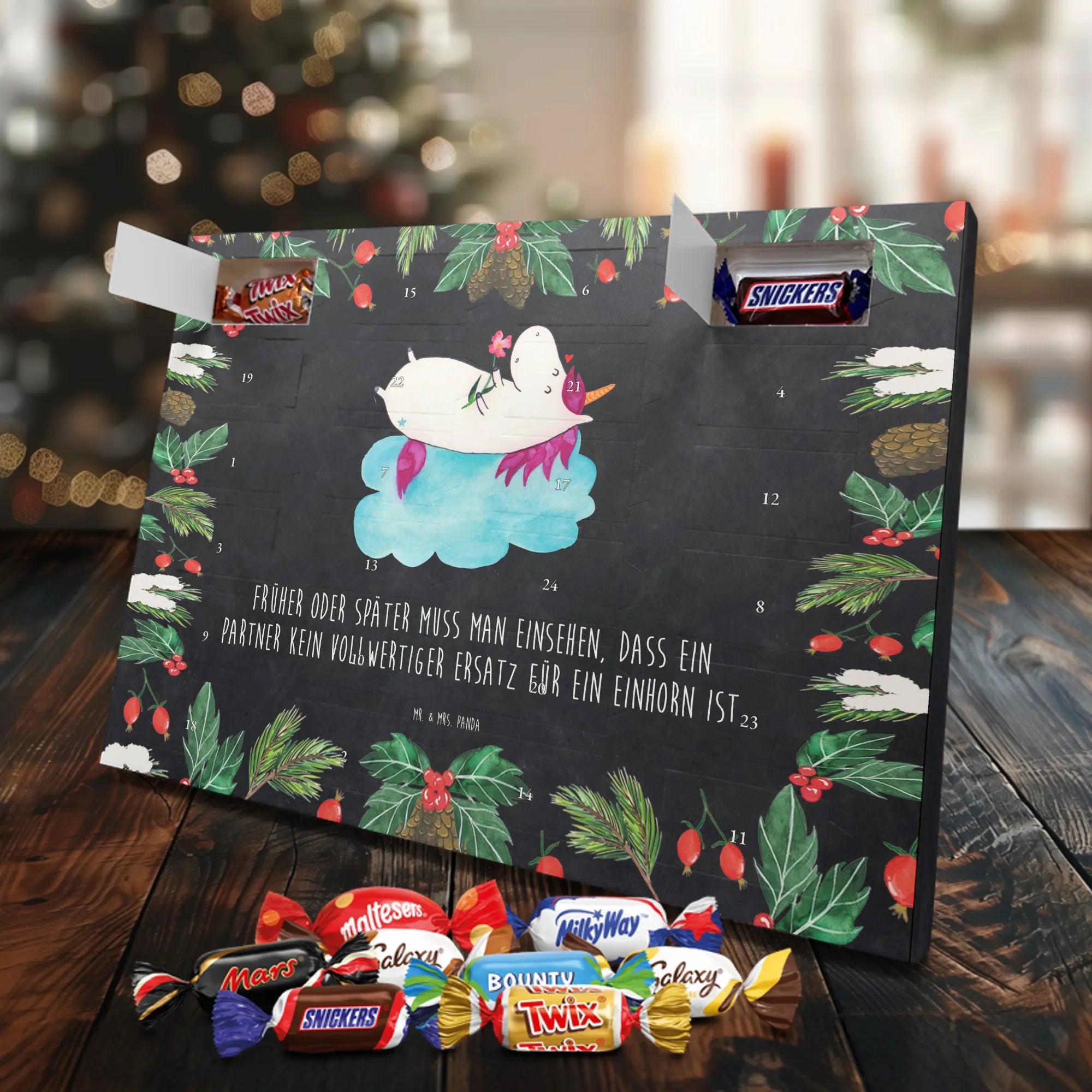 Unser Adventskalender mit Schokolade von Mr. & Mrs. Panda ist ein liebevoll gestaltetes Highlight für die Adventszeit. Die süßen Illustrationen und charmanten Sprüche sorgen für gute Stimmung bei Groß und Klein. Gedruckt in brillanter Qualität mit seidenmatter Oberflächenveredelung, wirken die Farben kräftig und edel; auch die Seitenflächen sind dekorativ bedruckt. Bitte beachten: Der Kalender ist nicht personalisierbar. Gefüllt ist er mit 24 Celebrations-Überraschungen in acht verschiedenen Sorten: Maltesers, Mars, Snickers, Twix, Milky Way, Bounty, Galaxy und Galaxy Caramel — perfekte Abwechslung für jeden Tag. Besonderheit: Du kannst den Kalender sowohl aufstellen als auch aufhängen. Maße: 325 mm x 225 mm x 27 mm. Schenke Vorfreude und kleine Genussmomente – ideal als Geschenk oder für deine eigene Adventszeit.