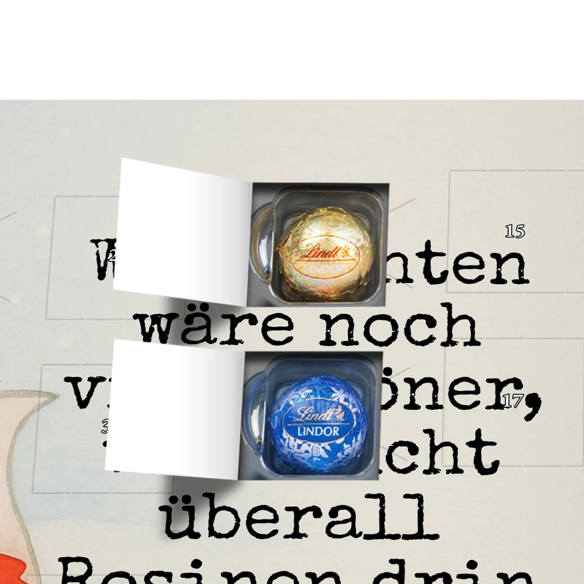 Unser zauberhafter Schoko Adventskalender von Mr. & Mrs. Panda bringt dir die süßeste Vorfreude auf Weihnachten! Dieser liebevoll gestaltete Adventskalender ist bedruckt mit wunderschönen Motiven & Sprüchen von Mr. & Mrs. Panda und ist nicht personalisierbar – dafür aber ein perfektes Geschenk für Freunde und Familie. Brillante Druckqualität mit seidenmatter Oberflächenveredelung sorgt für ein edles Finish, und die bedruckten Seitenflächen machen den Kalender von allen Seiten zu einem Hingucker. Maße: 233 mm x 178 mm x 24 mm. Besonderheit: kann aufgehängt oder aufgestellt werden, je nachdem, wie du ihn präsentieren möchtest. Gefüllt mit Lindt Lindor: 24 einzeln verpackte Markenschokoladen Kugeln in drei verschiedenen Sorten – Vollmilch, Feinherb und Weiße Schokolade – sorgen für abwechslungsreichen Genuss in der Adventszeit. Zutaten: Zucker, pflanzliches Fett (Kokosnuss, Palmkern), Kakaobutter, Vollmilchpulver, Kakaomasse, Milchzucker, Magermilchpulver, Butterreinfett, Emulgator (Sojalecithin), Gerstenmalzextrakt, Aromen. Besondere Hinweise: Kann Haselnüsse und Mandeln enthalten. Unser Schoko Adventskalender verbindet niedliches Design mit hochwertiger Füllung – ideal zum Verschenken oder selbst Naschen. Mr. & Mrs. Panda wünschen dir eine fröhliche und leckere Adventszeit!