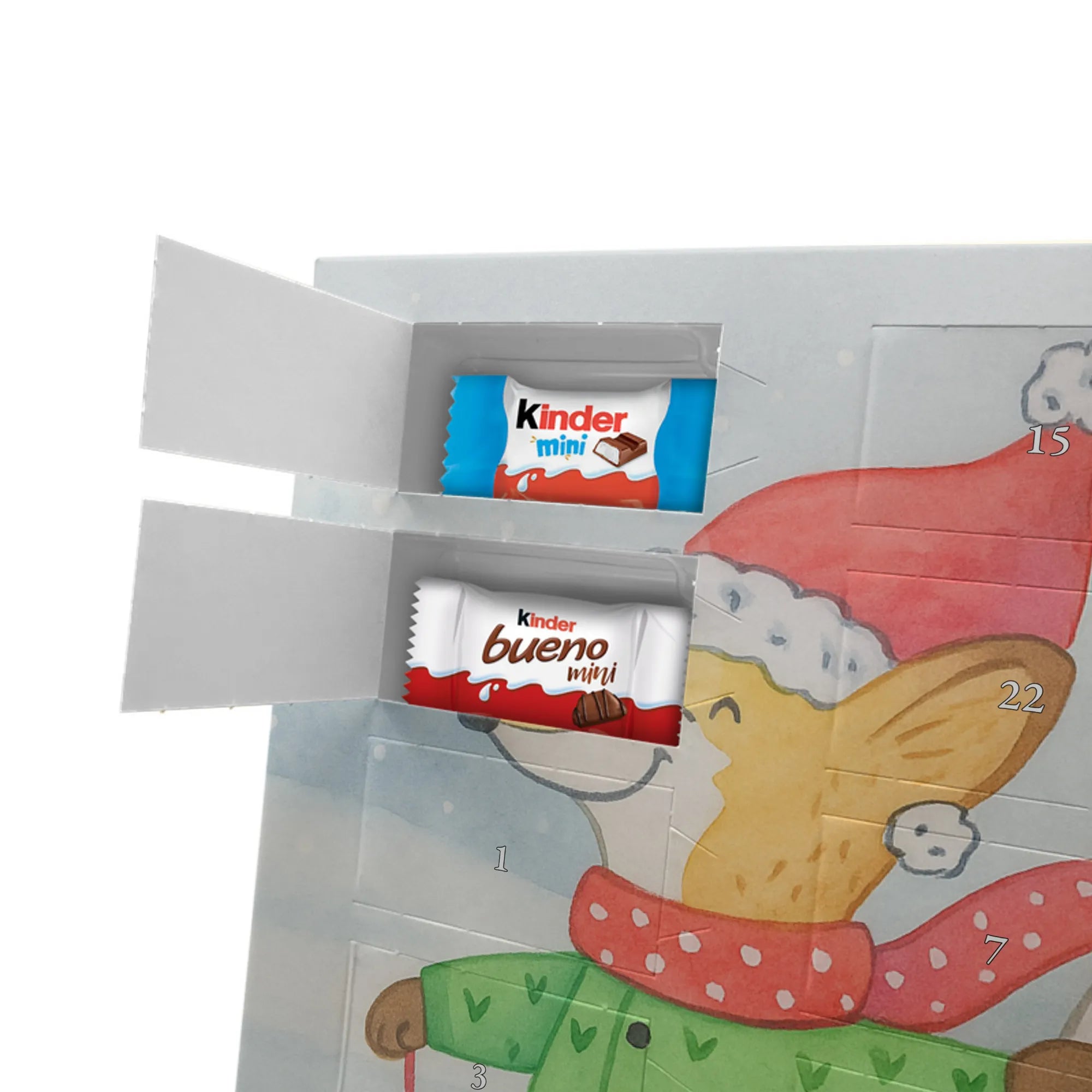 Adventskalender mit Schokolade – liebevoll gestaltet von Mr. & Mrs. Panda. Dieser niedliche Kalender ist bedruckt mit wunderschönen Motiven & Sprüchen von Mr. & Mrs. Panda und trotzdem nicht personalisierbar. Du bekommst brillante Druckqualität mit seidenmatter Oberflächenveredelung sowie bedruckte Seitenflächen, die dem Kalender ein hochwertiges Finish verleihen. Maße: 355 mm x 245 mm x 11 mm. Ein tolles Extra: kann aufgehängt oder aufgestellt werden, sodass du ihn flexibel platzieren kannst. Gefüllt mit Markenname Schokolade: Adventskalender gefüllt mit kinder® Schokolade. Inhalt: kinder® Schoko-Bons, kinder® Bueno mini und kinder® Schokolade mini. Die 24 Türchen sind liebevoll befüllt und sorgen jeden Tag für ein Lächeln – ideal für Kinder, Paare oder als kleines Geschenk für Freunde. Robust und dekorativ zugleich, bringt dieser Adventskalender süße Vorfreude in dein Zuhause. Verschenke oder genieße eine adventliche Zeit voller kleiner, schokoladiger Überraschungen!