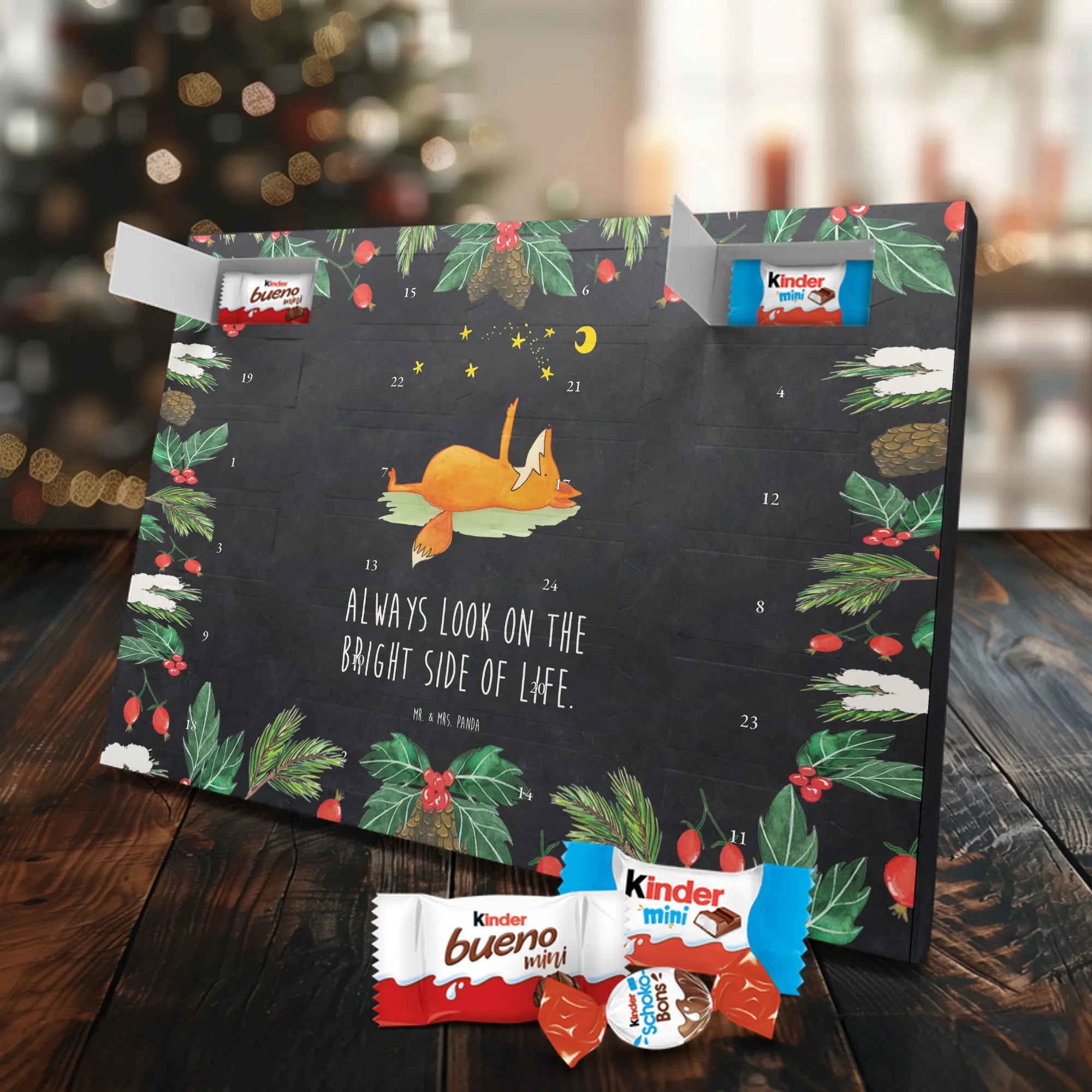 Schoko Adventskalender von Mr. & Mrs. Panda – die charmante Art, sich oder anderen die Adventszeit zu versüßen. Der Kalender ist bedruckt mit wunderschönen Motiven & Sprüchen von Mr. & Mrs. Panda und nicht personalisierbar. Wir legen Wert auf brillante Druckqualität mit seidenmatter Oberflächenveredelung sowie auf bedruckte Seitenflächen für ein stimmiges Gesamtbild. Maße: 355 mm x 245 mm x 11 mm. Besonders praktisch: kann aufgehängt oder aufgestellt werden und passt so in jede Wohnung. Gefüllt mit Markenname Schokolade: Adventskalender gefüllt mit kinder® Schokolade. Inhalt: kinder® Schoko-Bons, kinder® Bueno mini und kinder® Schokolade mini. Die 24 Türchen sind mit kleinen Schoko-Überraschungen bestückt und schaffen jeden Tag Vorfreude. Ob als Geschenk für Kinder, Partner oder als nette Aufmerksamkeit für Kolleginnen und Kollegen – dieser Kalender macht Freude. Robust, schön gestaltet und sofort einsatzbereit für die süßeste Zeit des Jahres!