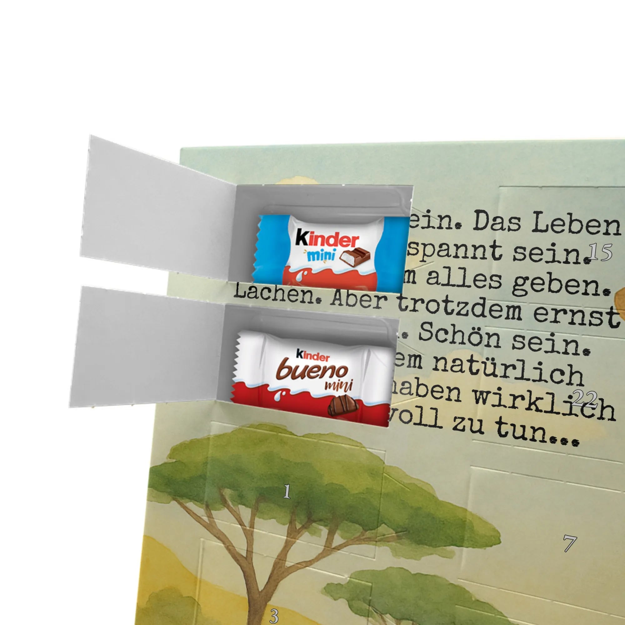 Entdecke unseren liebevoll gestalteten Schoko-Adventskalender von Mr. & Mrs. Panda – eine zauberhafte Idee, um die Tage bis Weihnachten zu versüßen. Der Kalender ist bedruckt mit wunderschönen Motiven & Sprüchen von Mr. & Mrs. Panda und ist nicht personalisierbar. Wir setzen auf brillante Druckqualität mit seidenmatter Oberflächenveredelung und bedruckte Seitenflächen für ein rundum schönes Erscheinungsbild. Maße: 355 mm x 245 mm x 11 mm. Die clevere Bauweise erlaubt es, den Kalender entweder aufzuhängen oder freistehend aufzustellen – so bist du flexibel bei der Dekoration. Gefüllt mit Markenname Schokolade: Adventskalender gefüllt mit kinder® Schokolade. Inhalt: kinder® Schoko-Bons, kinder® Bueno mini und kinder® Schokolade mini. Jeder Tag bringt eine kleine Freude und eignet sich perfekt als Geschenk oder als dekoratives Highlight in deinem Zuhause. Die stabile Verarbeitung sorgt dafür, dass der Kalender die ganze Adventszeit über Freude bereitet. Hol dir diesen Schoko-Adventskalender und lade die Vorweihnachtszeit mit süßen Überraschungen auf!