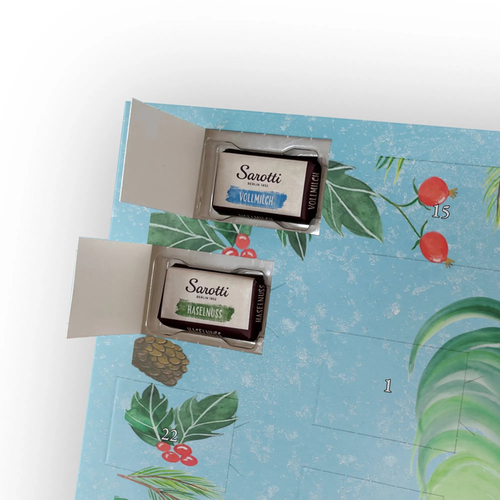 🐼 Schoko-Adventskalender: Liebevolles Design, seidenmatt, brillanter Druck – ein Hingucker.