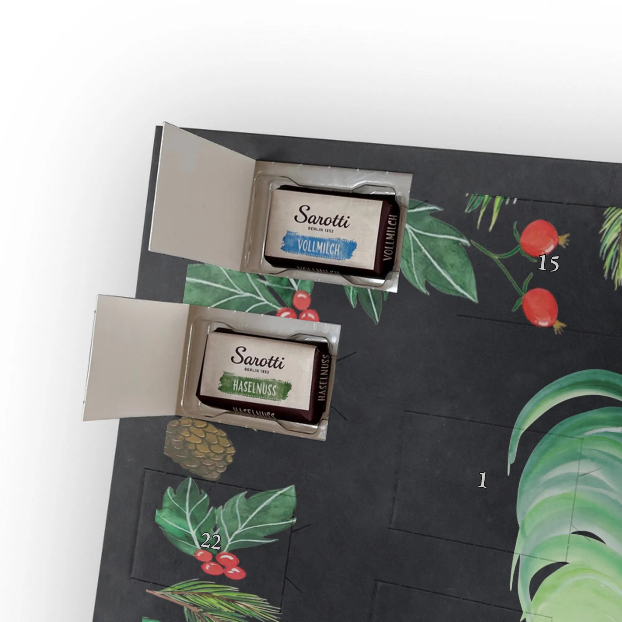 Mach die Vorweihnachtszeit besonders süß mit unserem Schoko-Adventskalender von Mr. & Mrs. Panda. Fröhliche Illustrationen und liebe Sprüche schmücken Vorder- und Seitenflächen, gedruckt in brillanter Qualität und veredelt mit einer seidenmatten Oberfläche für ein warmes, elegantes Finish. Der Kalender ist nicht personalisierbar, überzeugt dafür durch praktische Nutzung: zum Aufhängen oder Aufstellen geeignet. Hinter den 24 Türchen verbergen sich einzeln verpackte Schokoladentäfelchen in vier köstlichen Geschmacksrichtungen – Vollmilch, Nougat, Zartbitter und Haselnuss – von Sarotti® und Confiserie Heidel®. Insgesamt liefert der Kalender 107 g Markenschokolade. Maße: 355 mm x 245 mm x 11 mm – ideal, um Adventsfreude dekorativ zu präsentieren. Verschenke Liebe und Genuss in einem schönen Design, das sich wunderbar in jede Weihnachtsecke einfügt. Mr. & Mrs. Panda wünscht dir eine gemütliche Adventszeit voller kleiner, süßer Überraschungen.