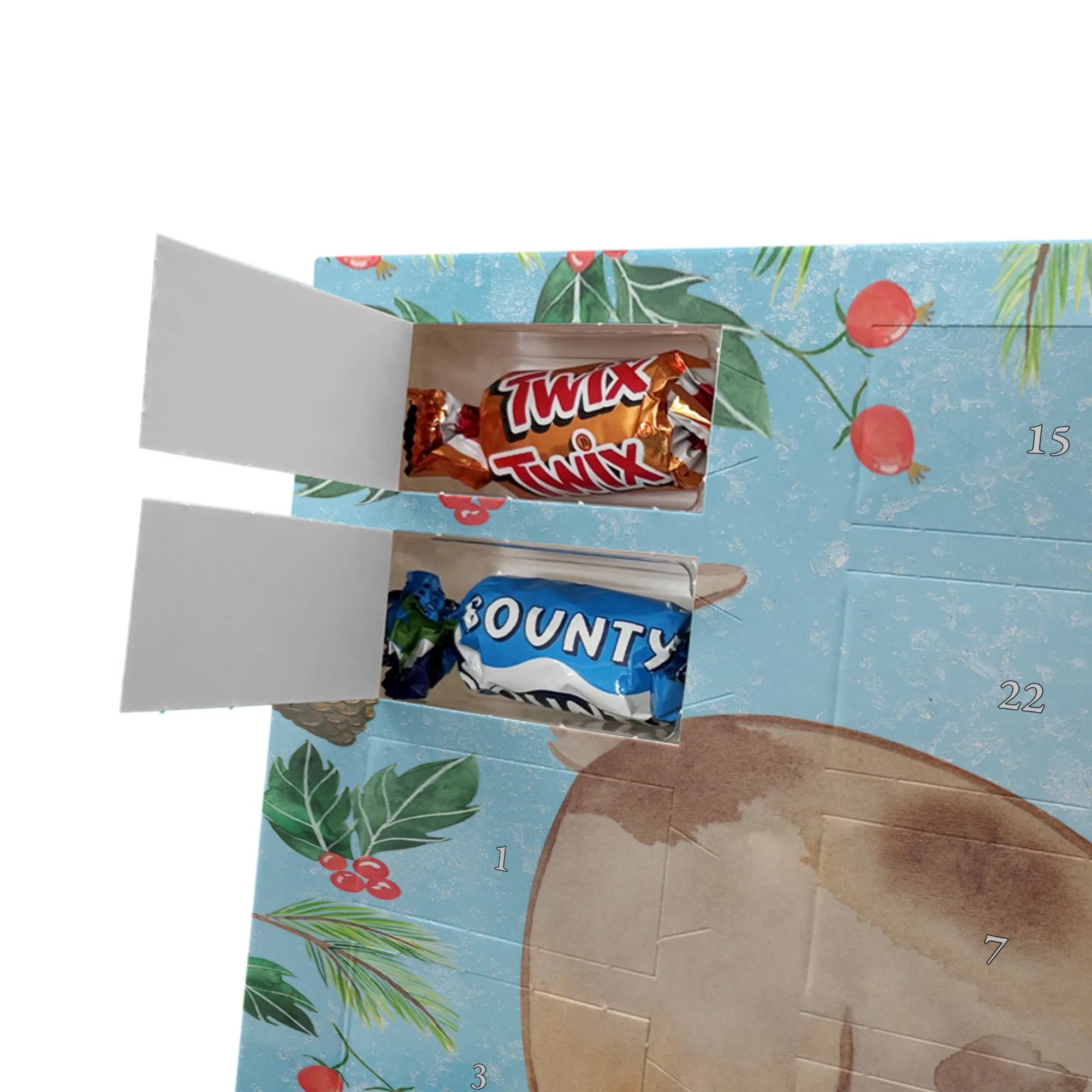 Unser Schoko Adventskalender von Mr. & Mrs. Panda bringt dir und deinen Lieben jede Menge Vorfreude und zauberhafte Momente in die Adventszeit. Der Kalender ist liebevoll bedruckt mit wunderschönen Motiven und frechen Sprüchen im typischen Mr. & Mrs. Panda Stil – ein echter Blickfang auf dem Tisch oder an der Wand. Die brillante Druckqualität kombiniert mit einer seidenmatten Oberflächenveredelung sorgt für edle Farben und ein angenehmes Gefühl beim Anfassen. Auch die Seitenflächen sind bedruckt, sodass der Kalender von allen Seiten hübsch aussieht. Er ist nicht personalisierbar, dafür aber in seiner Gestaltung rundum stimmig. Gefüllt ist der Adventskalender mit 24 hochwertigen Celebrations-Füllungen in acht verschiedenen Sorten: Maltesers, Mars, Snickers, Twix, Milky Way, Bounty, Galaxy und Galaxy Caramel — so ist für jede Naschkatze etwas dabei. Die Besonderheit: Du kannst den Kalender entweder aufstellen oder dank rückseitiger Aufhängung an die Wand hängen. Maße: 325 mm x 225 mm x 27 mm. Ein liebevolles Geschenk für Familie, Freunde oder einfach für dich selbst, das kleine tägliche Glücksmomente schenkt und die Adventszeit versüßt.