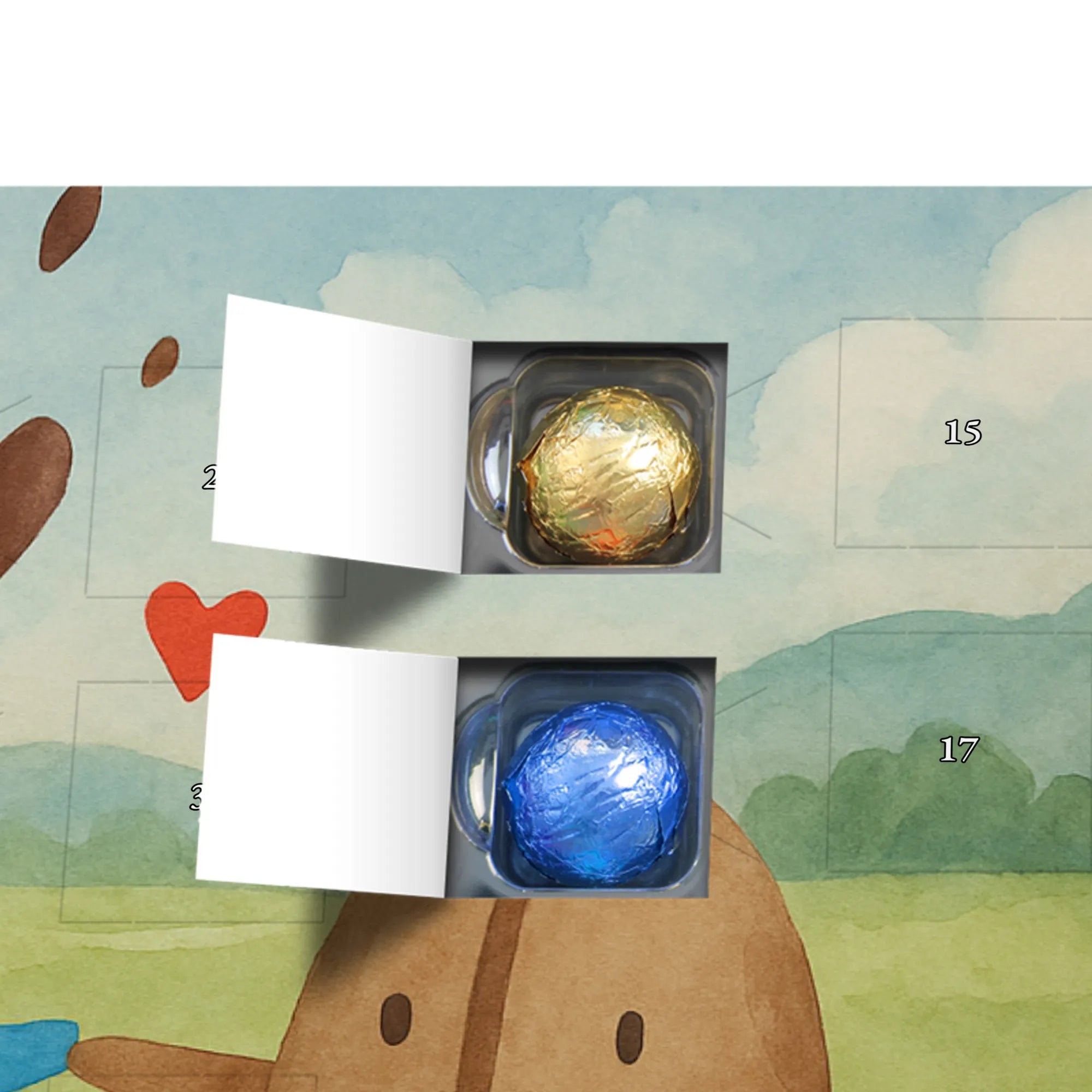 Wunderschöner Adventskalender Schokolade von Mr. & Mrs. Panda – die perfekte Mischung aus Charme und Genuss. Unser Adventskalender Schokolade ist liebevoll gestaltet und bedruckt mit wunderschönen Motiven & Sprüchen von Mr. & Mrs. Panda, die jede Adventszeit verschönern. Der Kalender ist nicht personalisierbar, aber dafür mit viel Liebe zum Detail produziert. Er besticht durch brillante Druckqualität mit seidenmatter Oberflächenveredelung und bedruckte Seitenflächen, die für eine elegante Optik sorgen. Maße: 233 mm x 178 mm x 24 mm. Durch seine stabile Form kannst du ihn aufstellen oder an die Wand hängen – Besonderheit: kann aufgehängt oder aufgestellt werden. Gefüllt mit MARKENNAMEN Schokolade und gefüllt mit leckeren Schokoladenkugeln, bietet er jeden Tag eine leckere Überraschung. Bitte beachte die besonderen Hinweise: (Kann Spuren von Haselnüssen, Mandeln, Gluten und Soja enthalten!), kühl und trocken lagern. Ob als kleines Geschenk, Tischdeko oder Adventsüberraschung für Kinder und Erwachsene – dieser Kalender bringt ein Lächeln in die Vorweihnachtszeit. Viel Spaß beim täglichen Türchenöffnen wünscht dir Mr. & Mrs. Panda!