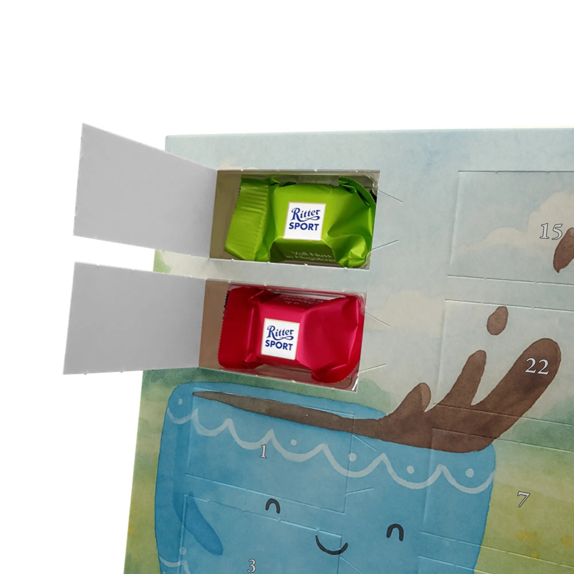 Adventskalender mit Schokolade – so schmeckt Vorfreude! Unser Mr. & Mrs. Panda Adventskalender ist liebevoll gestaltet und bedruckt mit wunderschönen Motiven & Sprüchen, die jeden Tag versüßen. Die brillante Druckqualität mit seidenmatter Oberflächenveredelung sorgt für ein edles Finish, und auch die Seitenflächen sind hübsch bedruckt. Der Kalender ist nicht personalisierbar, dafür aber vielseitig einsetzbar: Maße: 325 mm x 225 mm x 27 mm und die besondere Eigenschaft, dass du ihn aufgehängt oder aufgestellt verwenden kannst, geben dir Flexibilität bei der Dekoration. Gefüllt ist der Kalender mit Ritter Sport Schokowürfeln in beliebten Geschmacksrichtungen wie Mousse au Chocolat, Schoko Crisp, Voll-Nuss in Nougatcreme, Karamell Duo, Joghurt und Erdbeer-Joghurt. Wichtig: Es handelt sich um einen Kalender gefüllt mit Ritter Sport Schokolade, nicht um einen Kalender der Marke Ritter Sport. Ideal als Geschenk oder als Adventsdeko für dein Zuhause – kleine Schokofreuden warten hinter jedem Türchen.