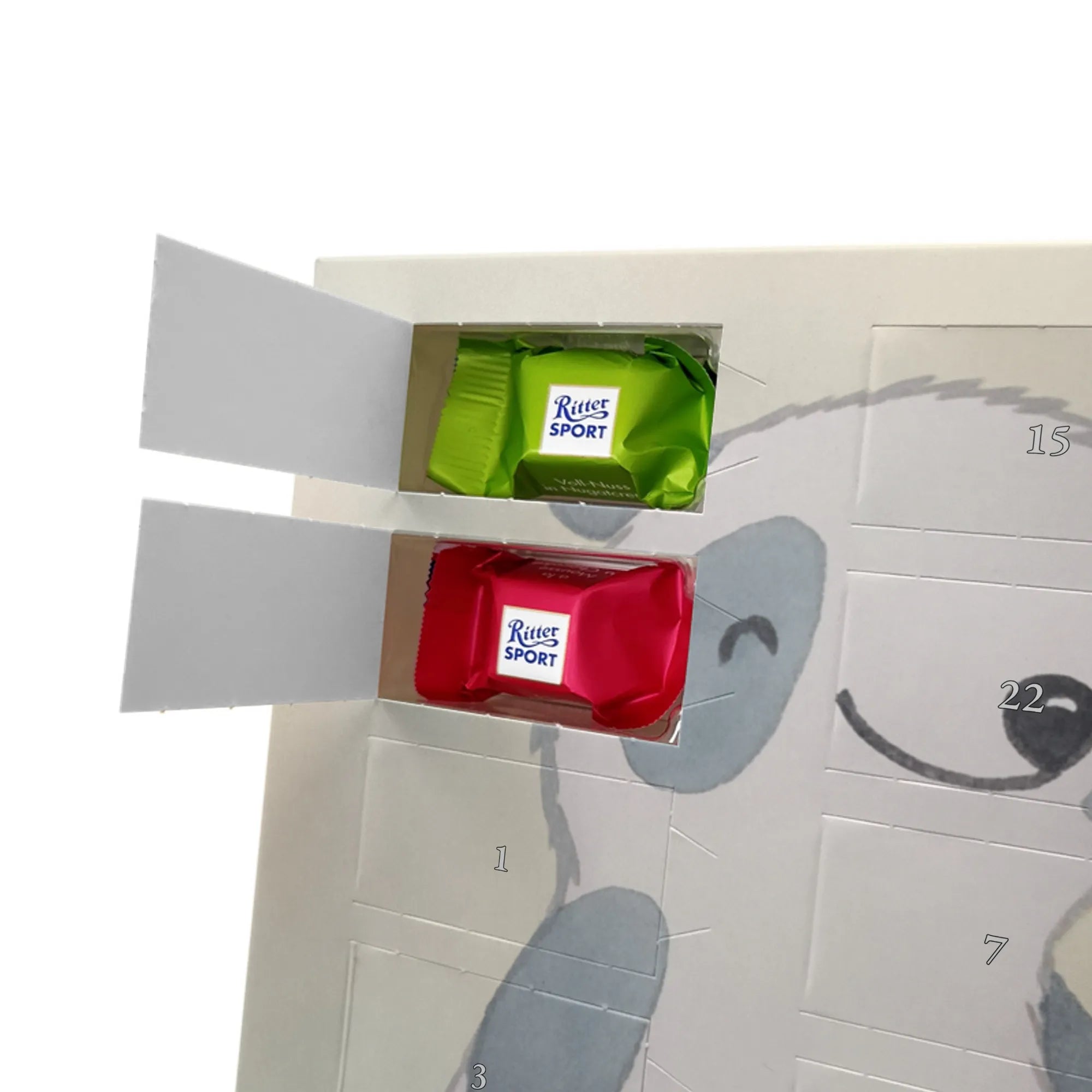🐼 24 Türchen gefüllt mit Ritter Sport Schokowürfeln – perfekte Adventsüberraschungen.