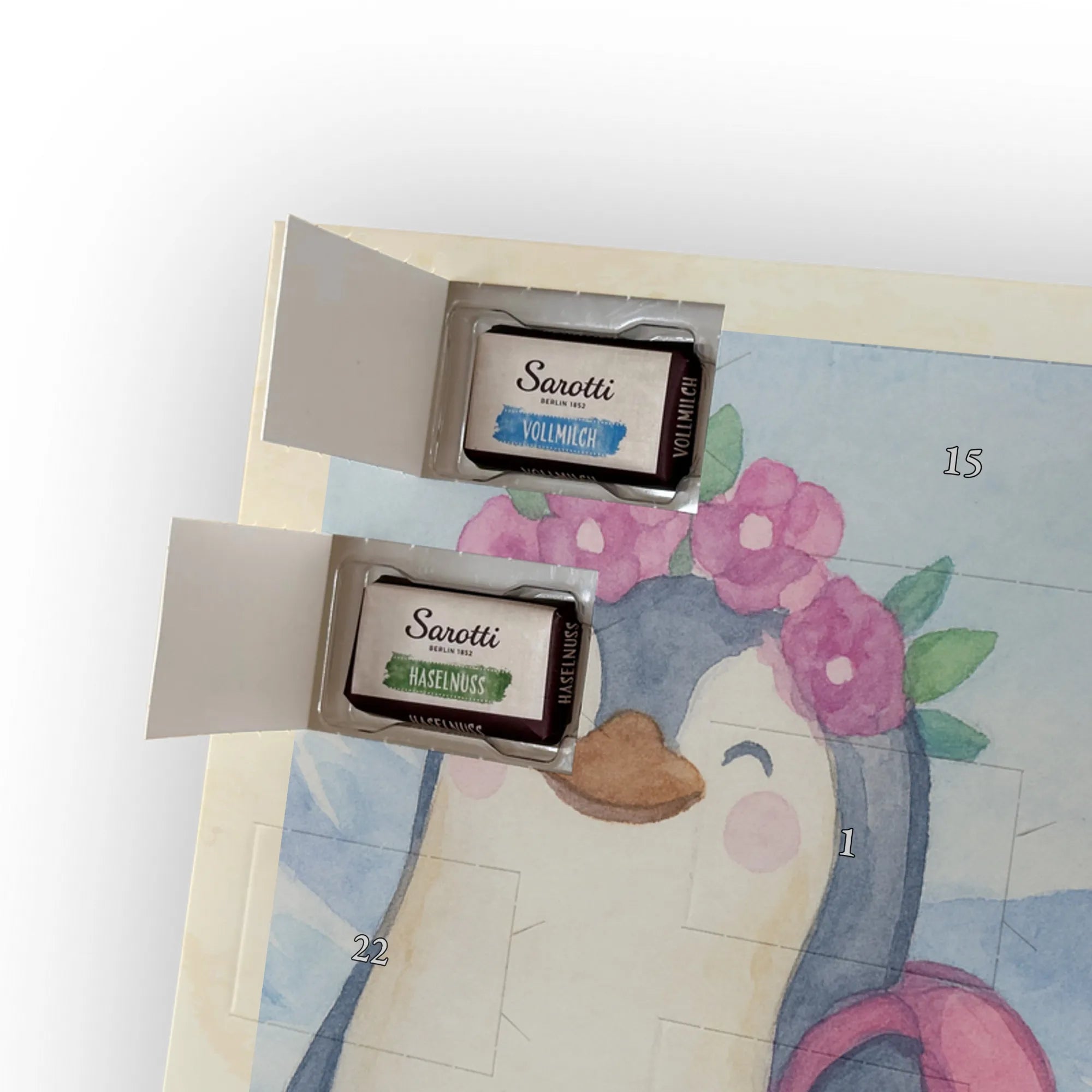 🐼 Schoko-Adventskalender: Liebevolles Design, seidenmatt, brillanter Druck – ein Hingucker.