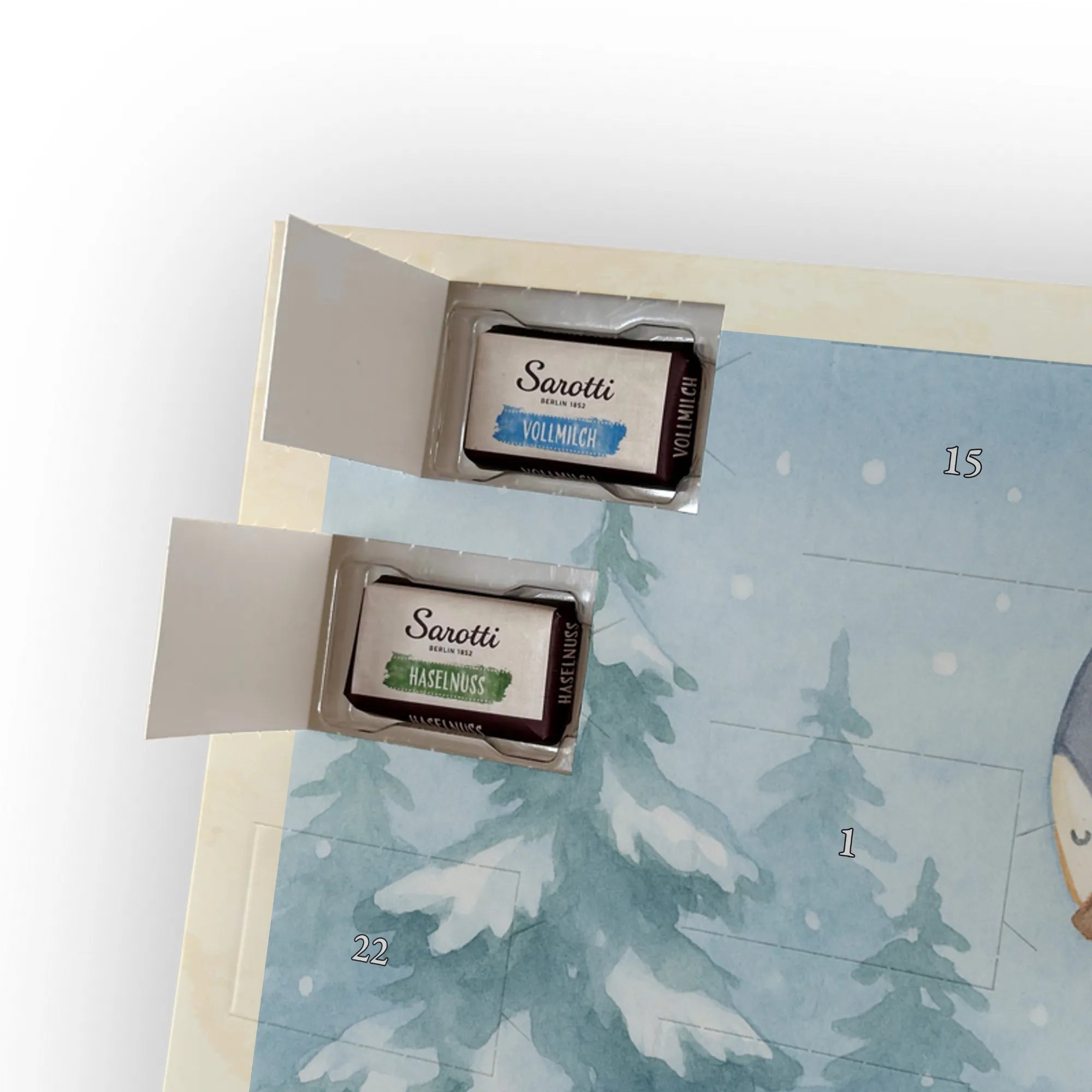 🐼 ADVENTSKALENDER MIT SCHOKOLADE: Liebevolle Illustrationen, seidenmatter Druck, 325×225×27 mm.