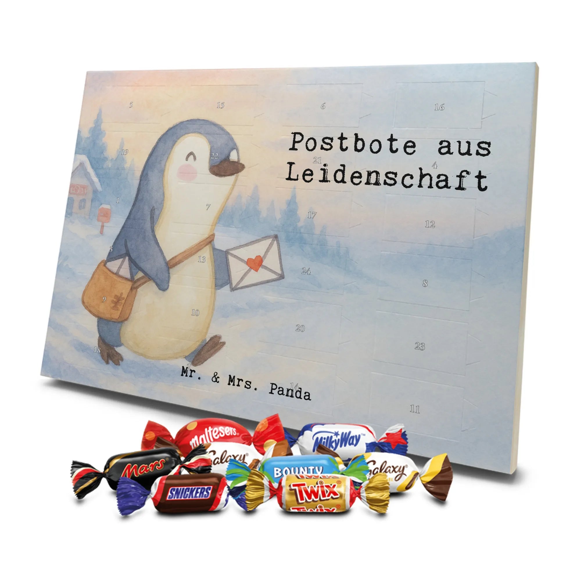 Unser Adventskalender mit Schokolade von Mr. & Mrs. Panda ist ein liebevoll gestaltetes Highlight für die Adventszeit. Die süßen Illustrationen und charmanten Sprüche sorgen für gute Stimmung bei Groß und Klein. Gedruckt in brillanter Qualität mit seidenmatter Oberflächenveredelung, wirken die Farben kräftig und edel; auch die Seitenflächen sind dekorativ bedruckt. Bitte beachten: Der Kalender ist nicht personalisierbar. Gefüllt ist er mit 24 Celebrations-Überraschungen in acht verschiedenen Sorten: Maltesers, Mars, Snickers, Twix, Milky Way, Bounty, Galaxy und Galaxy Caramel — perfekte Abwechslung für jeden Tag. Besonderheit: Du kannst den Kalender sowohl aufstellen als auch aufhängen. Maße: 325 mm x 225 mm x 27 mm. Schenke Vorfreude und kleine Genussmomente – ideal als Geschenk oder für deine eigene Adventszeit.