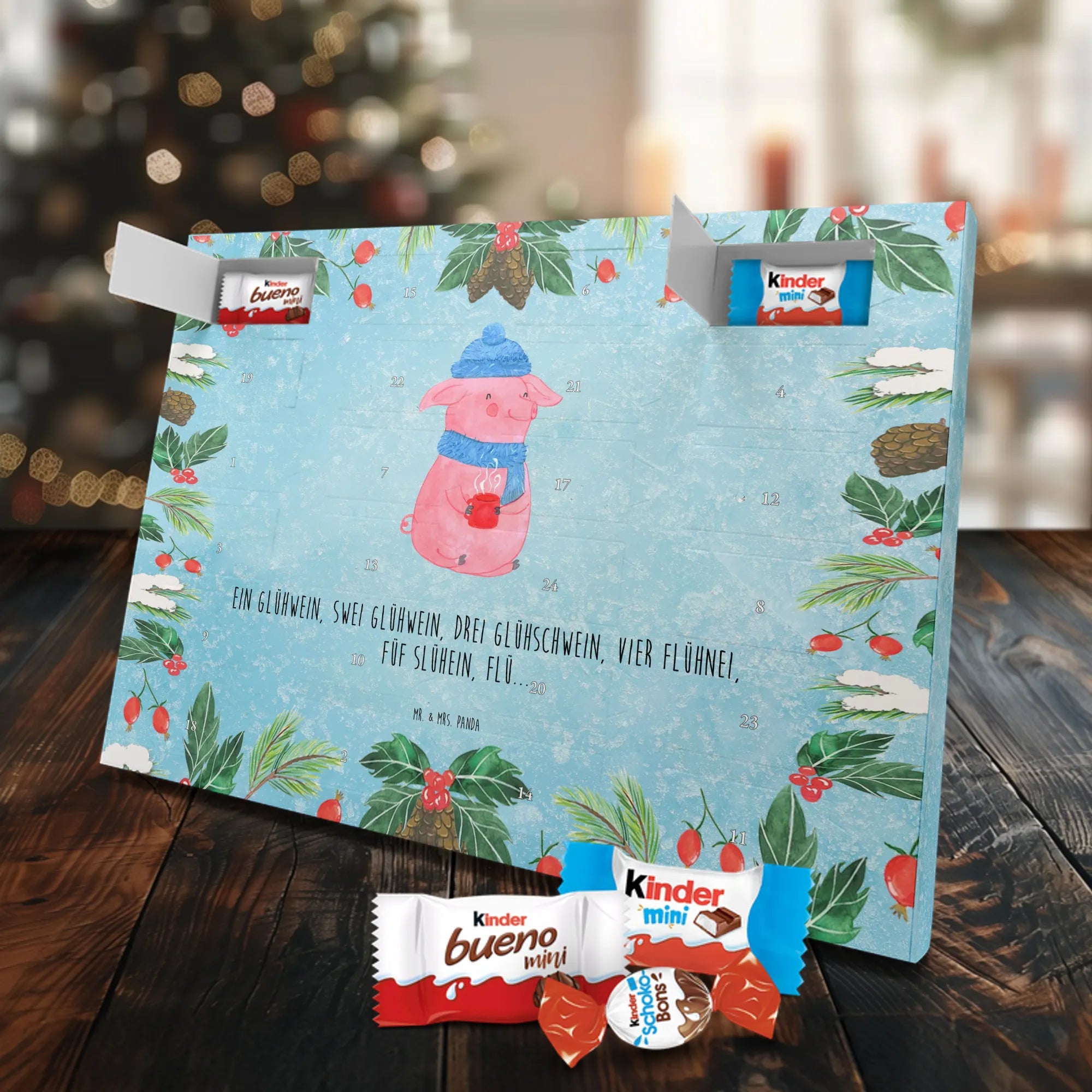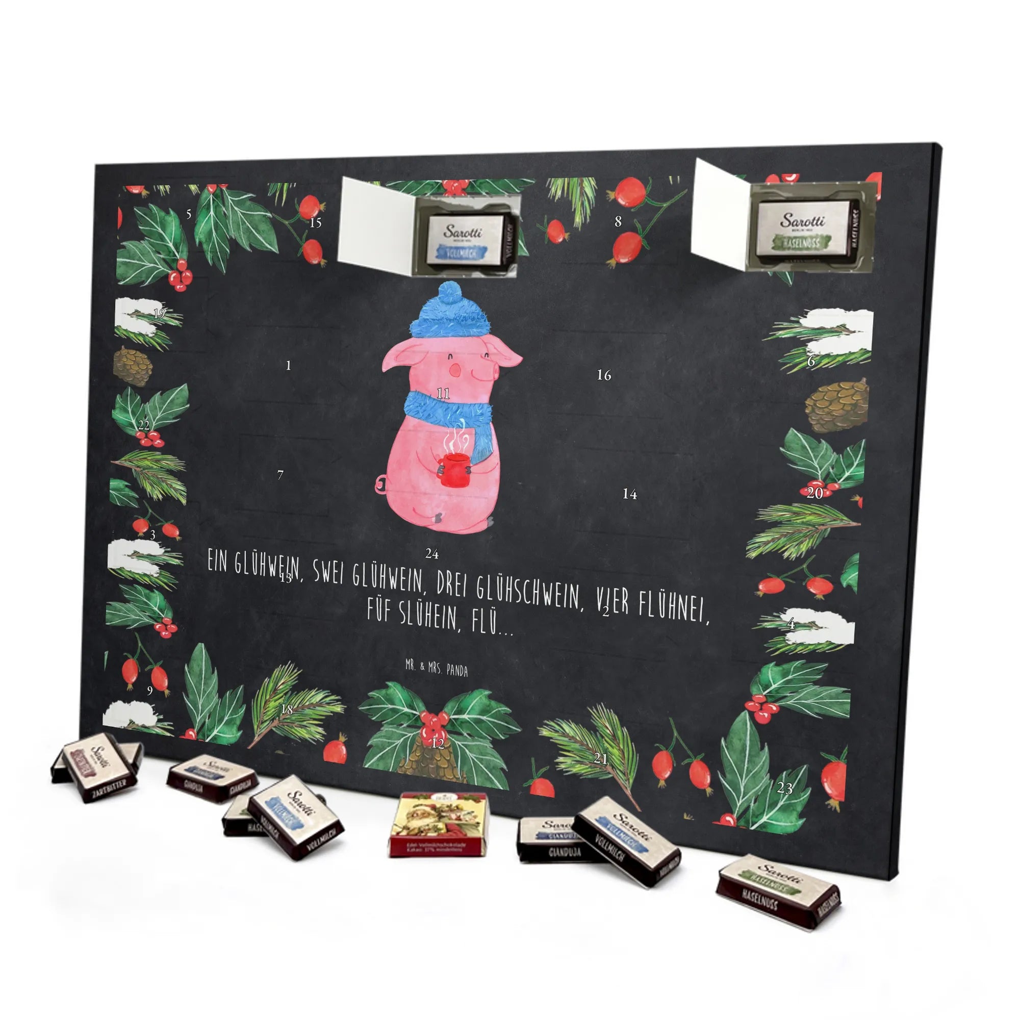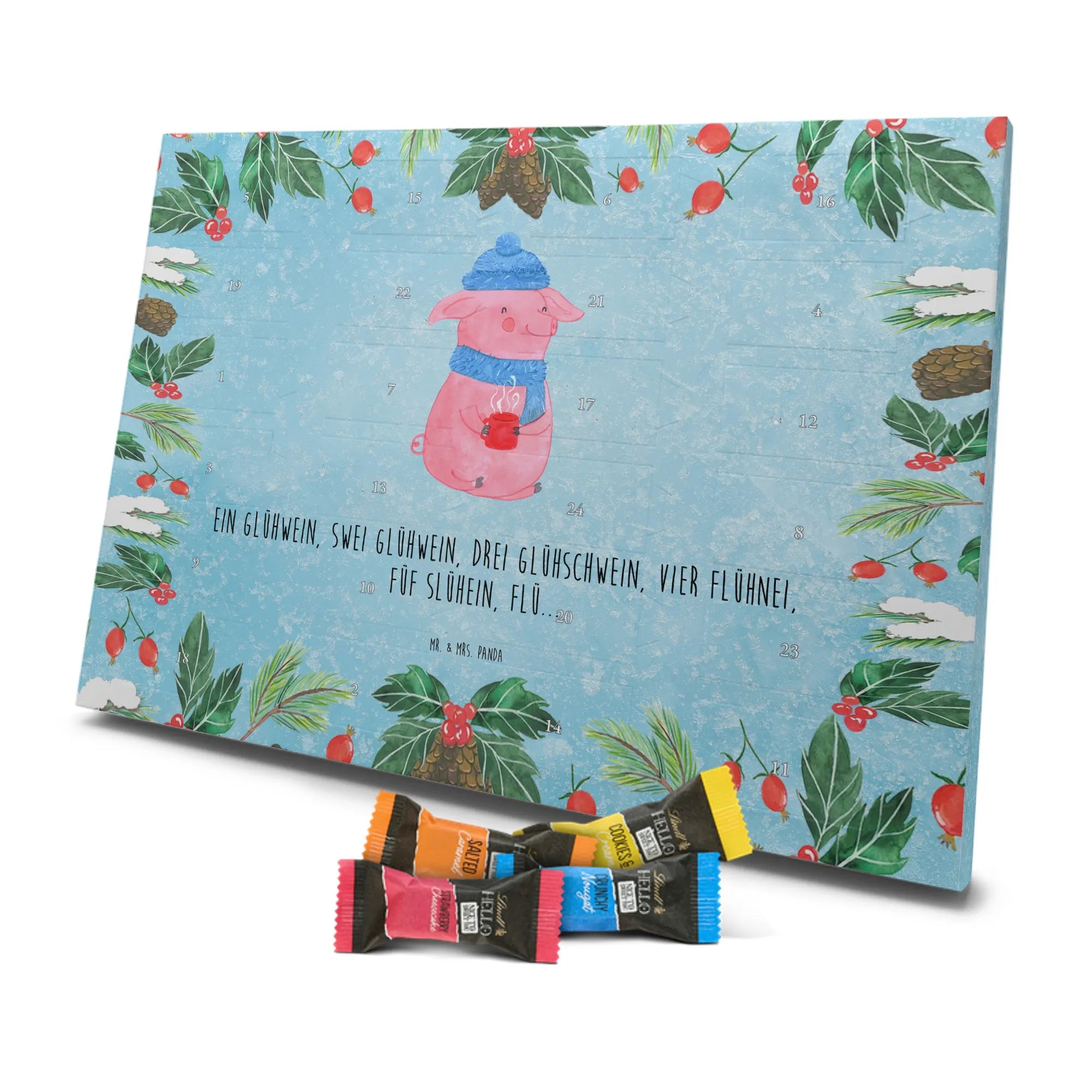 Juhuu — die schönste Zeit im Jahr beginnt! Unser Schoko Adventskalender „Lallelndes Glühschwein“ aus der Winter Kollektion von Mr. & Mrs. Panda bringt Weihnachtsmarkt-Feeling direkt zu dir nach Hause. Das fröhliche, rosafarbene Glühschwein mit blauer Mütze und Schal hält eine dampfende rote Tasse und zaubert mit dem lustigen Spruch „Ein Glühwein, Swei Glühwein, drei Glühschwein, vier Flühnei, Füf Slühein, Flü...“ ein tägliches Lächeln in die Adventszeit. 🎄
