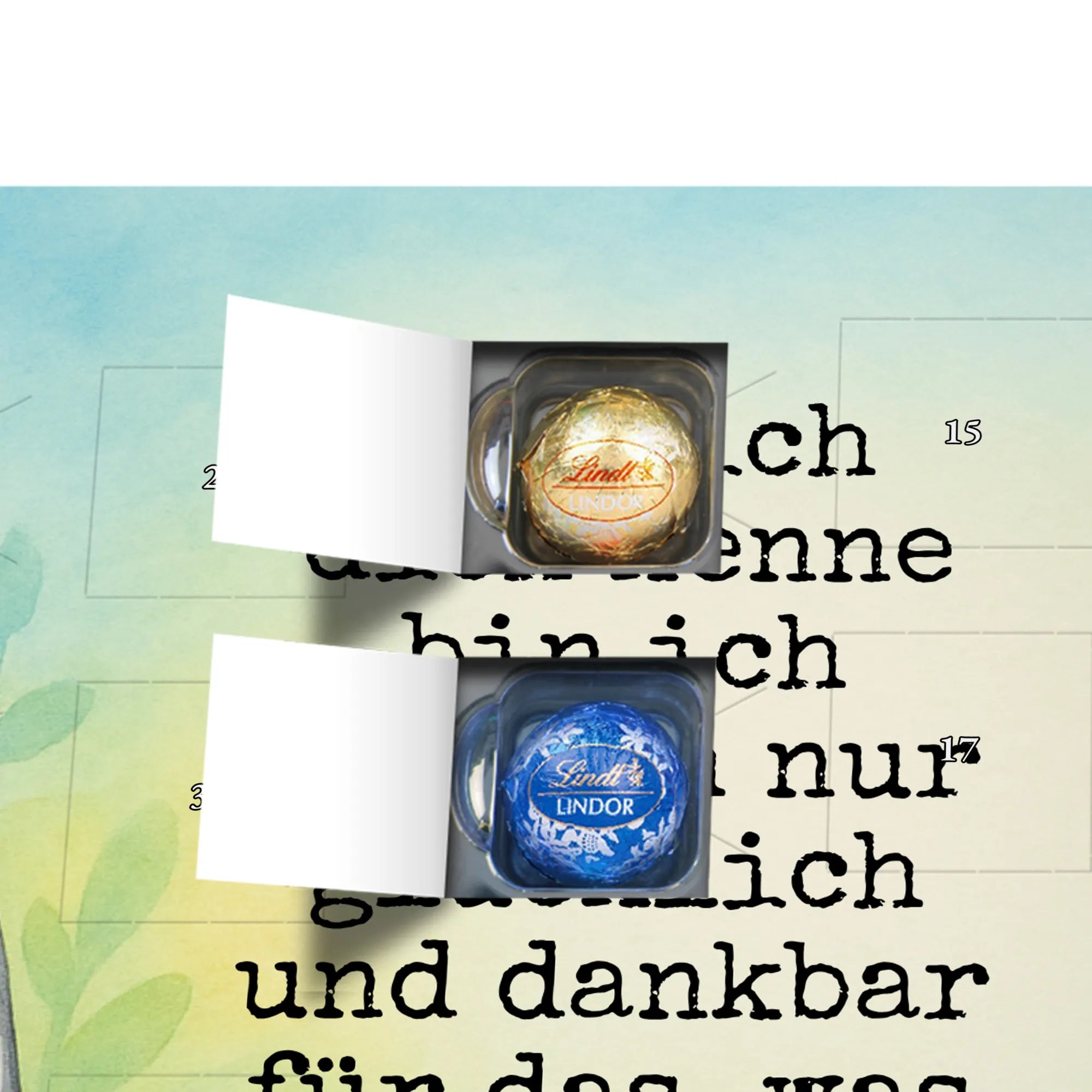 Der Adventskalender mit Schokolade von Mr. & Mrs. Panda ist ein echter Blickfang und eine köstliche Überraschung für die Vorweihnachtszeit. Er ist bedruckt mit wunderschönen Motiven & Sprüchen von Mr. & Mrs. Panda und nicht personalisierbar – deshalb perfekt als unkompliziertes Geschenk. Die brillante Druckqualität und die seidenmatte Oberflächenveredelung sorgen für eine hochwertige Optik, ergänzt durch bedruckte Seitenflächen. Maße: 233 mm x 178 mm x 24 mm. Besonderheit: kann aufgehängt oder aufgestellt werden, ganz wie es dir gefällt. Gefüllt mit Lindt Lindor: 24 einzeln verpackte Markenschokoladen Kugeln in den Sorten Vollmilch, Feinherb und Weiße Schokolade bieten täglich neue Geschmackserlebnisse. Zutaten: Zucker, pflanzliches Fett (Kokosnuss, Palmkern), Kakaobutter, Vollmilchpulver, Kakaomasse, Milchzucker, Magermilchpulver, Butterreinfett, Emulgator (Sojalecithin), Gerstenmalzextrakt, Aromen. Besondere Hinweise: Kann Haselnüsse und Mandeln enthalten. Ob als Mitbringsel, Geschenk oder zum Selbstverwöhnen – dieser Adventskalender vereint schönes Design mit zarter Markenschokolade.