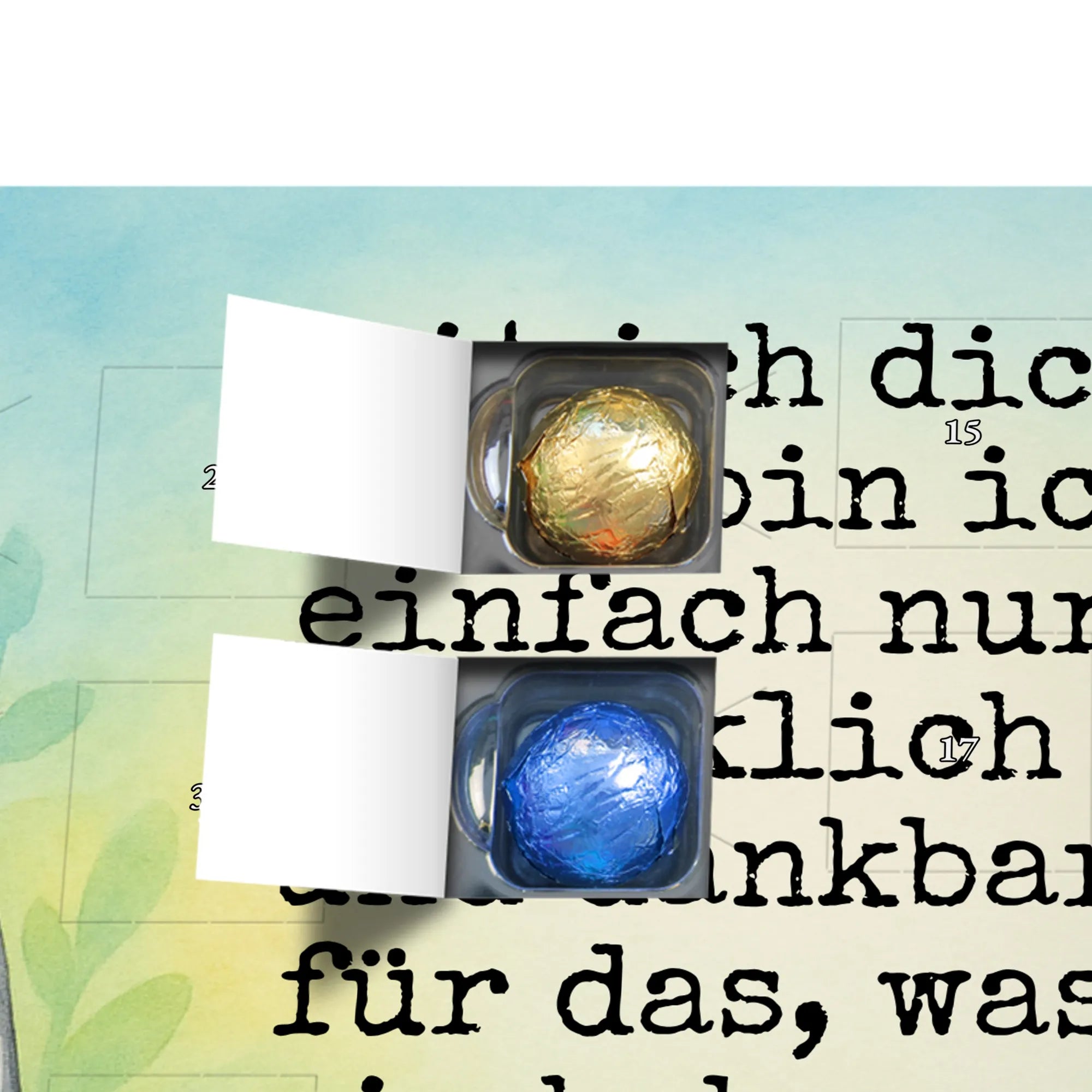 Schon unser Schoko-Adventskalender von Mr. & Mrs. Panda gesehen? Ein liebevoll gestalteter Kalender, bedruckt mit wunderschönen Motiven & Sprüchen, der deine Adventszeit versüßt. Der Kalender ist nicht personalisierbar, überzeugt aber durch brillante Druckqualität mit seidenmatter Oberflächenveredelung und bedruckte Seitenflächen für ein rundum schönes Erscheinungsbild. Maße: 325 mm x 225 mm x 27 mm. Du kannst ihn aufhängen oder aufstellen – ganz wie es dir gefällt. Gefüllt mit Ritter Sport Schokowürfeln in köstlichen Sorten: Mousse au Chocolat, Schoko Crisp, Voll-Nuss in Nougatcreme, Karamell Duo, Joghurt und Erdbeer-Joghurt. Bitte beachten: Es handelt sich um einen Kalender gefüllt mit Ritter Sport Schokolade, nicht um einen Kalender der Marke Ritter Sport. Ob als Geschenk oder für dich selbst – dieser Schoko-Adventskalender bringt täglich kleine Glücksmomente und süße Überraschungen.