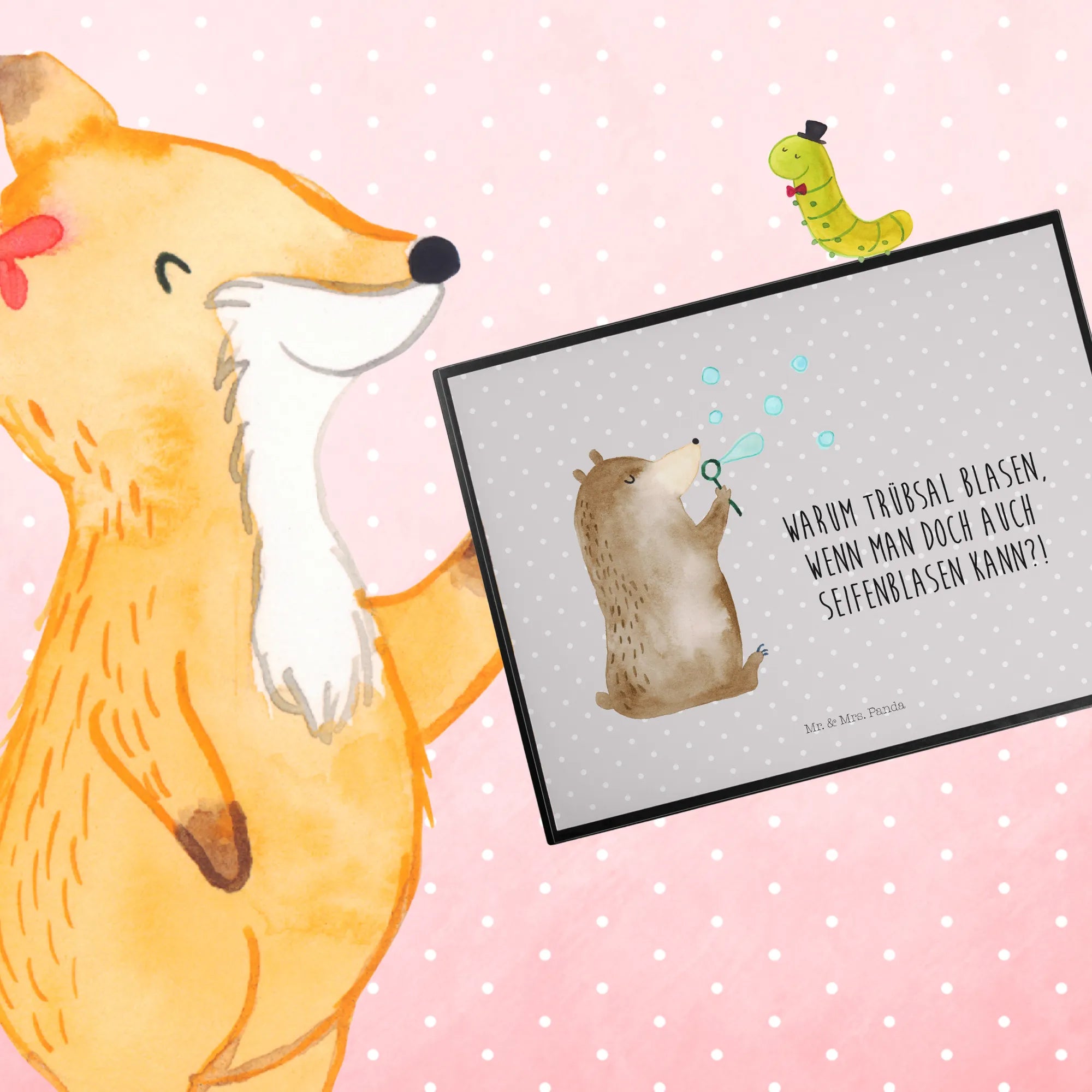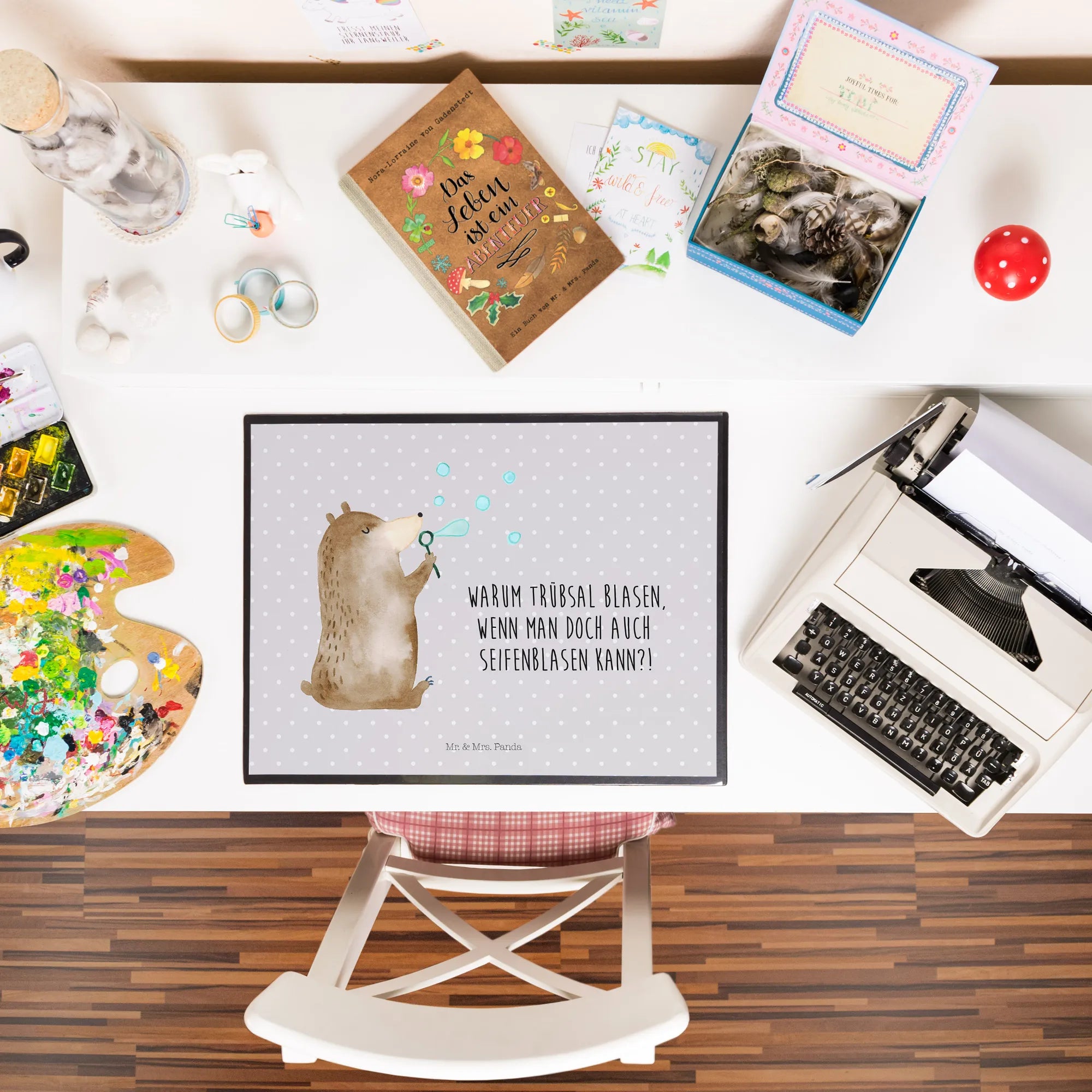Die Schreibtischunterlage Bär Seifenblasen von Mr. & Mrs. Panda ist mehr als nur ein praktisches Büroaccessoire – sie ist ein kleiner Begleiter für glückliche Momente! Mit einem liebevoll gestalteten Motiv eines fröhlichen Bären, der Seifenblasen bläst, bringt sie Lebendigkeit und Freude in Deinen Alltag. Die Umarmung von Farben und der witzige Slogan 'Warum Trübsal blasen, wenn man doch auch Seifenblasen kann?!' sorgen dafür, dass Du beim Arbeiten, Schreiben oder Lernen stets ein Lächeln im Gesicht hast. Diese Schreibtischunterlage ist ideal für Kinder im Kindergarten, Schüler in der Schule oder Erwachsene im Büro – einfach überall dort, wo Kreativität und gute Laune gefragt sind.
