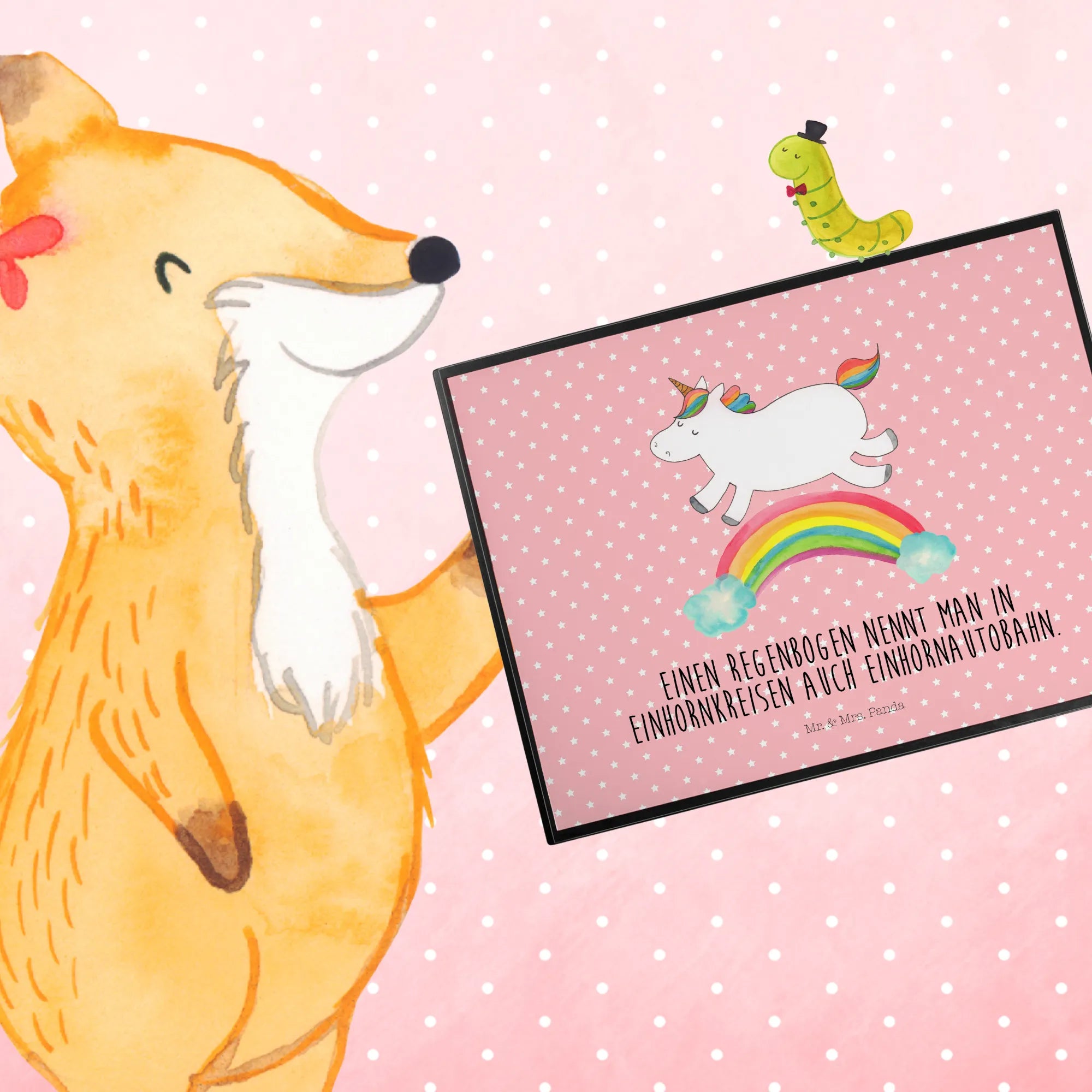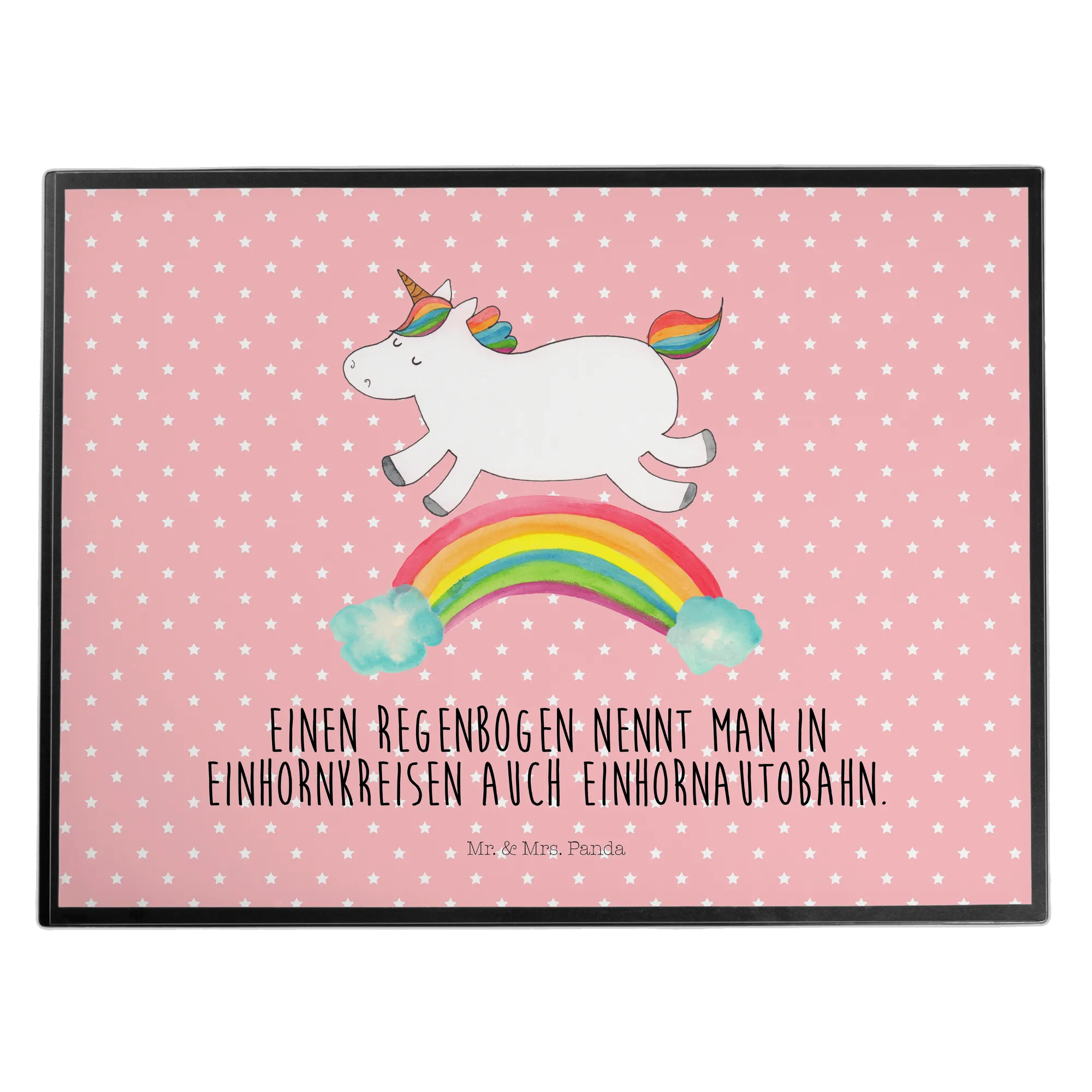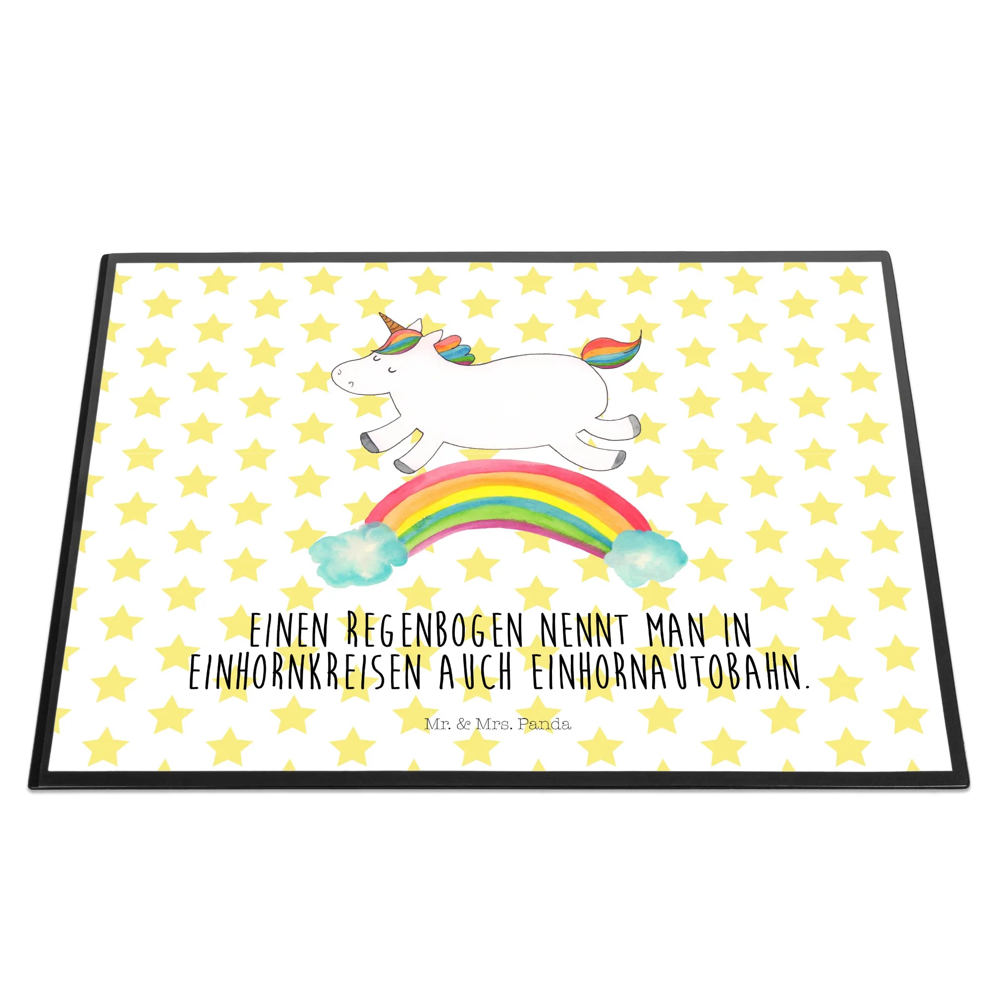 Die zauberhafte Schreibtischunterlage Einhorn Regenbogen von Mr. & Mrs. Panda ist das perfekte Geschenk für all diejenigen, die die magische Welt der Einhörner lieben. Mit seinen fröhlichen Farben und dem niedlichen Motiv, das ein fröhliches Einhorn zeigt, das über einen bunten Regenbogen flitzt, wird diese Schreibtischauflage jeden Schreibtisch auf zauberhafte Weise verschönern. Mit der lustigen Botschaft 'Einen Regenbogen nennt man in Einhornkreisen auch Einhornautobahn' bringt sie ein Lächeln in jeden Arbeitsalltag.