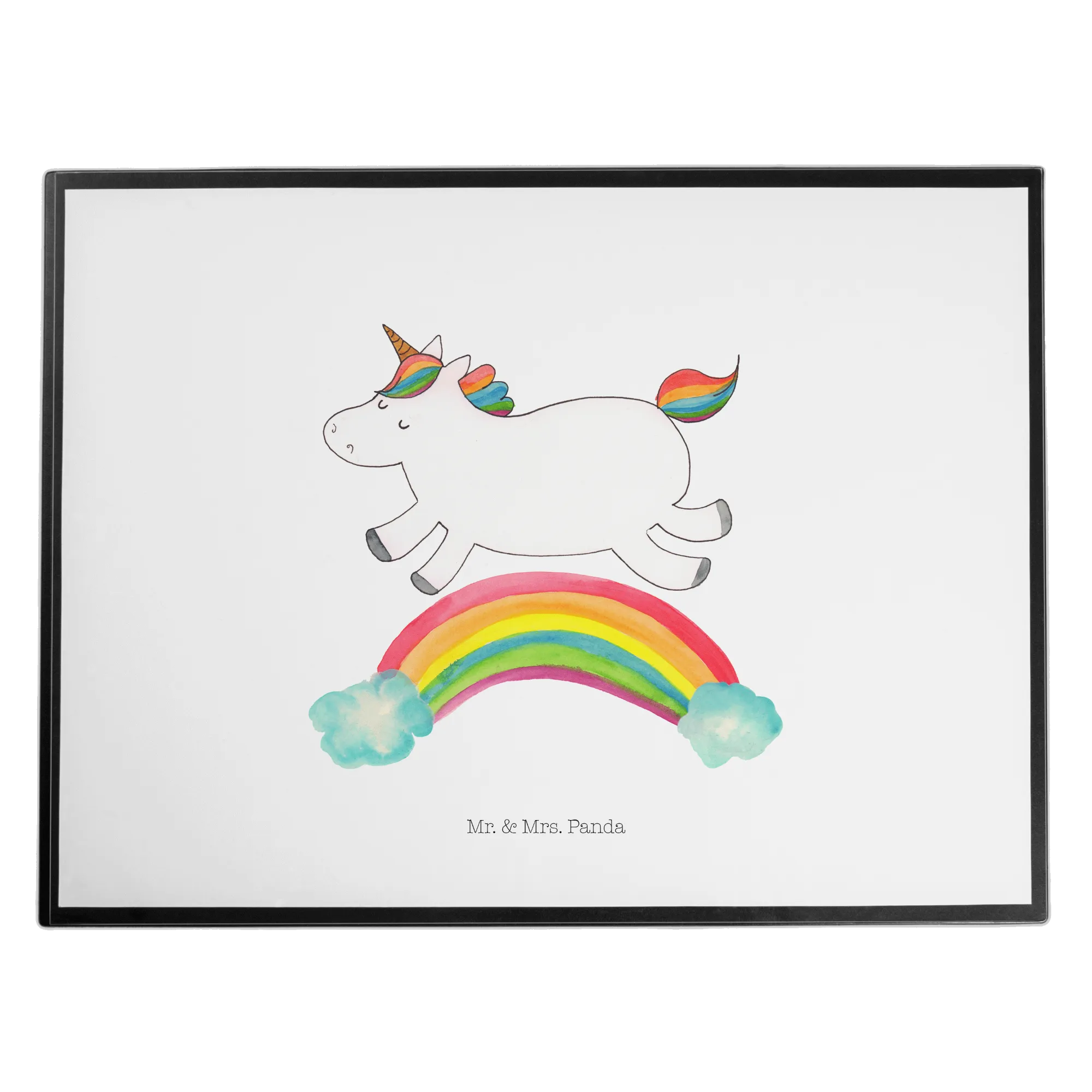 Die Schreibtischunterlage Einhorn Regenbogen von Mr. & Mrs. Panda ist das perfekte Geschenk für alle, die die zauberhafte Welt der Einhörner lieben! Sie misst 400 mm x 530 mm und ist aus hochwertigem Zellkautschuk "Made in Germany", was sie besonders robust und rutschfest macht. Mit ihrem fröhlichen Design, das ein süßes Einhorn zeigt, das über einen Regenbogen flitzt, bringt sie Farbe und Freude in jeden Arbeitsplatz.