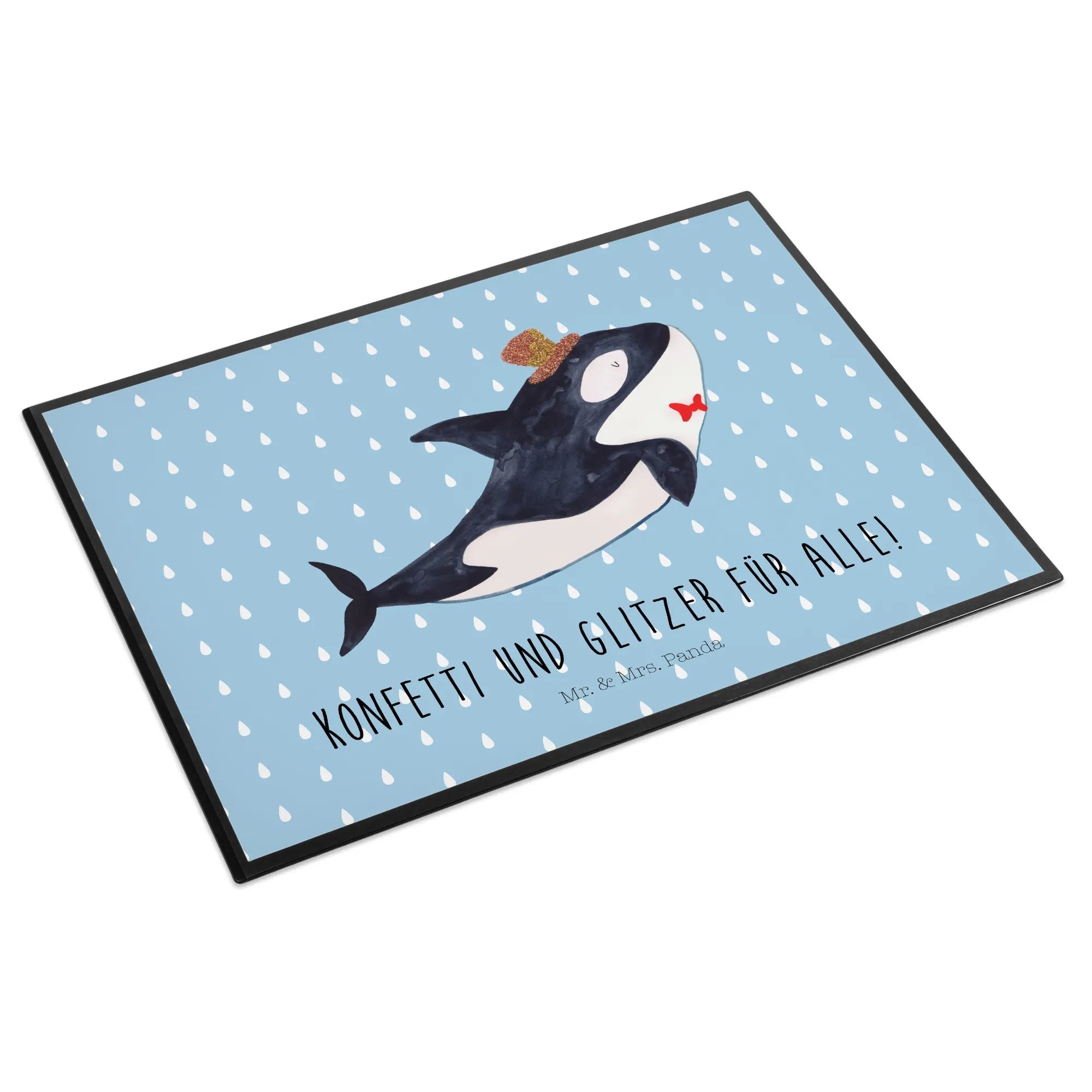 Die Schreibtischunterlage Orca Zylinder von Mr. & Mrs. Panda ist das perfekte Zusammenspiel von Funktionalität und Freude! Mit ihrem bezaubernden Design bringt sie gute Laune in jeden Büroalltag. Auf der Unterlage prangt ein fröhlich lächelnder Orca in einem stylischen Zylinder, umgeben von bunten Akzenten, die an Konfetti und Glitzer erinnern. Ideal für Geburtstagsfeiern, besondere Anlässe oder einfach nur um die Arbeitsatmosphäre aufzuhellen!