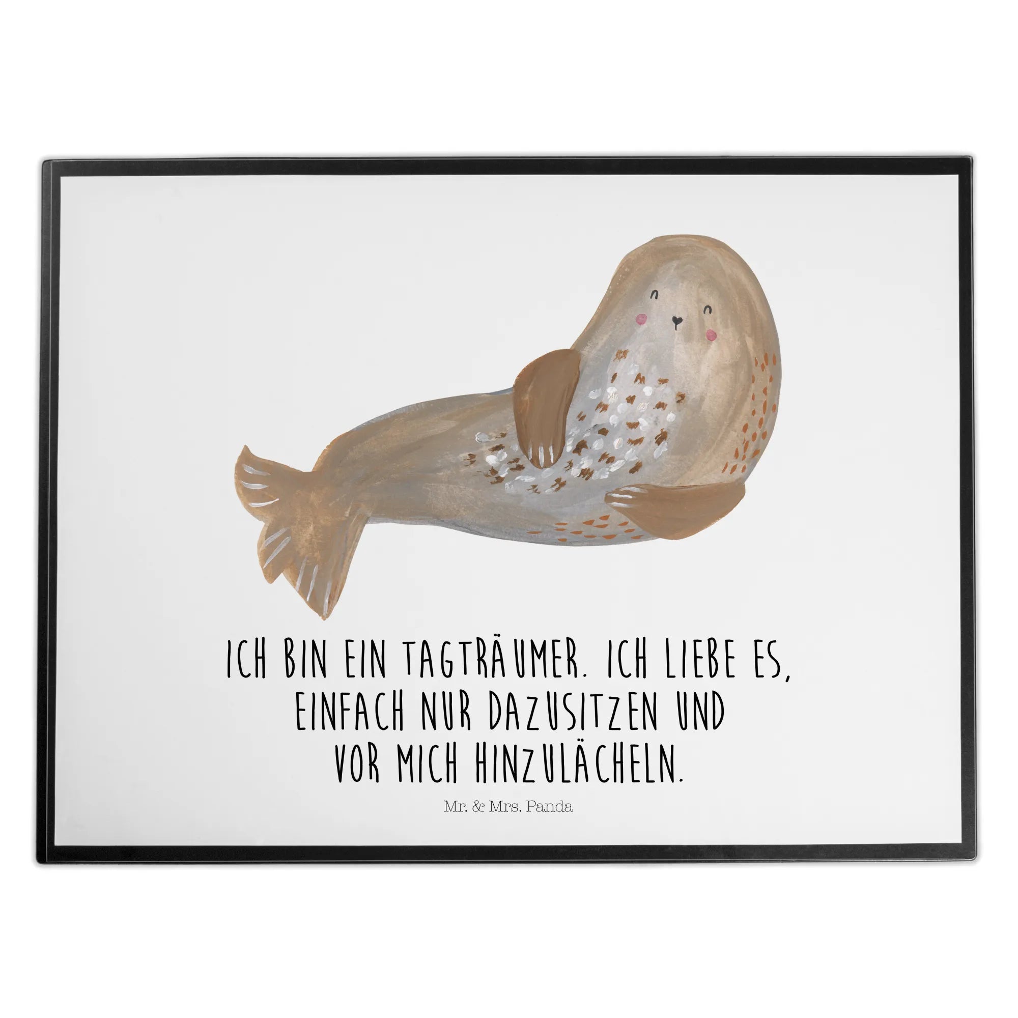 Stell dir vor, du spazierst entlang der sanft plätschernden Wellen der Ostsee, als dir plötzlich eine lachende Robbe begegnet. Ihr glückliches Lachen ist so ansteckend, dass du nicht anders kannst, als mit ihr zu schmunzeln. Dieses charmante Wesen hält sich den Bauch vor Lachen, während es auf einem sonnenbeschienenen Strand döst und träumt. Wie dieses bezaubernde Meerestier, so lädt auch der Spruch 'Ich bin ein Tagträumer. Ich liebe es, einfach nur dazusitzen und vor mich hinzulächeln' dazu ein, das Leben zu genießen und in Momenten des puren Glücks zu verweilen. Ein aufrichtiger Moment des Lächelns, eingefangen in einem liebevollen Motiv von Mr. & Mrs. Panda, erinnert uns daran, die Schönheit des Lebens nie aus den Augen zu verlieren.