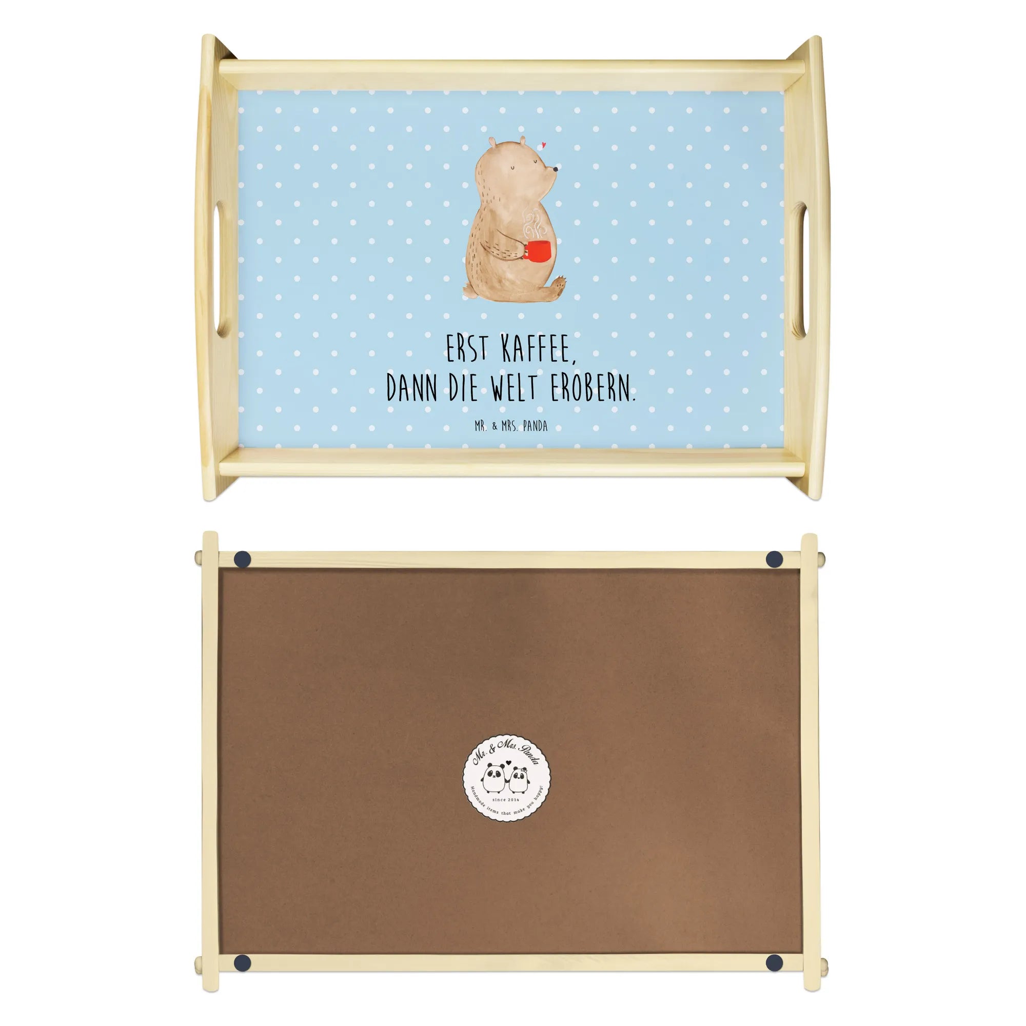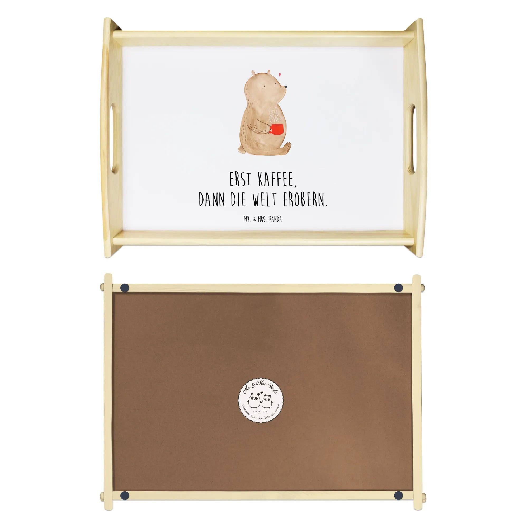 Das einzigartige Serviertablett von Mr. & Mrs. Panda wird dein Frühstücksbuffet zum Erlebnis machen! Mit seinen großzügigen Maßen von 480 mm x 480 mm x 65 mm und einem Gewicht von 925 g ist es die perfekte Kombination aus Funktionalität und Stil. Aus hochwertigem, lasiertem Echtholz gefertigt, verzückt das Tablett mit einem strahlenden Druck, der für gute Laune sorgt. Ob im Bett oder auf dem Sofa, die seitlichen Griffmulden garantieren ein angenehmes Handling. Die spezielle Anti-Rutsch Beschichtung sorgt dafür, dass alles sicher an seinem Platz bleibt. Dank der kratzfesten Oberfläche ist das Tablett sehr pflegeleicht – einfach mit einem feuchten Tuch und etwas Spülmittel abwischen. Bitte nicht einweichen! Denke daran, dass die Anfertigung wegen der hohen Qualität etwas Zeit in Anspruch nimmt.